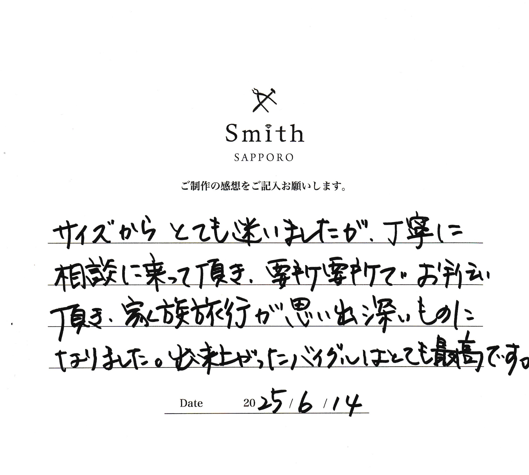 バングルはそのまま着けてお持ち帰り頂きました。永く使えるデザインですので、バングルをつける度に、楽しい家族旅行と北海道を思い出してくれると嬉しいです!