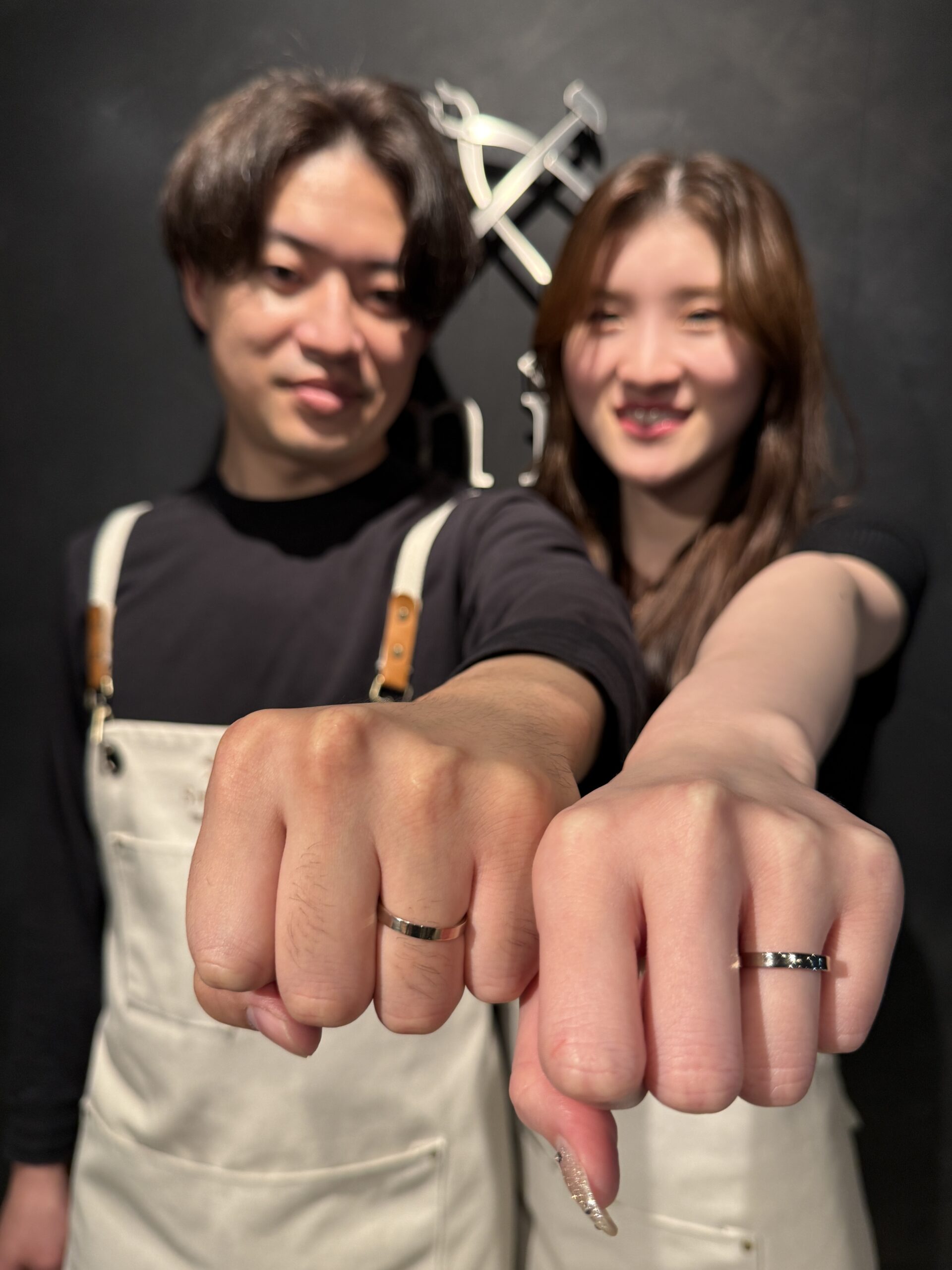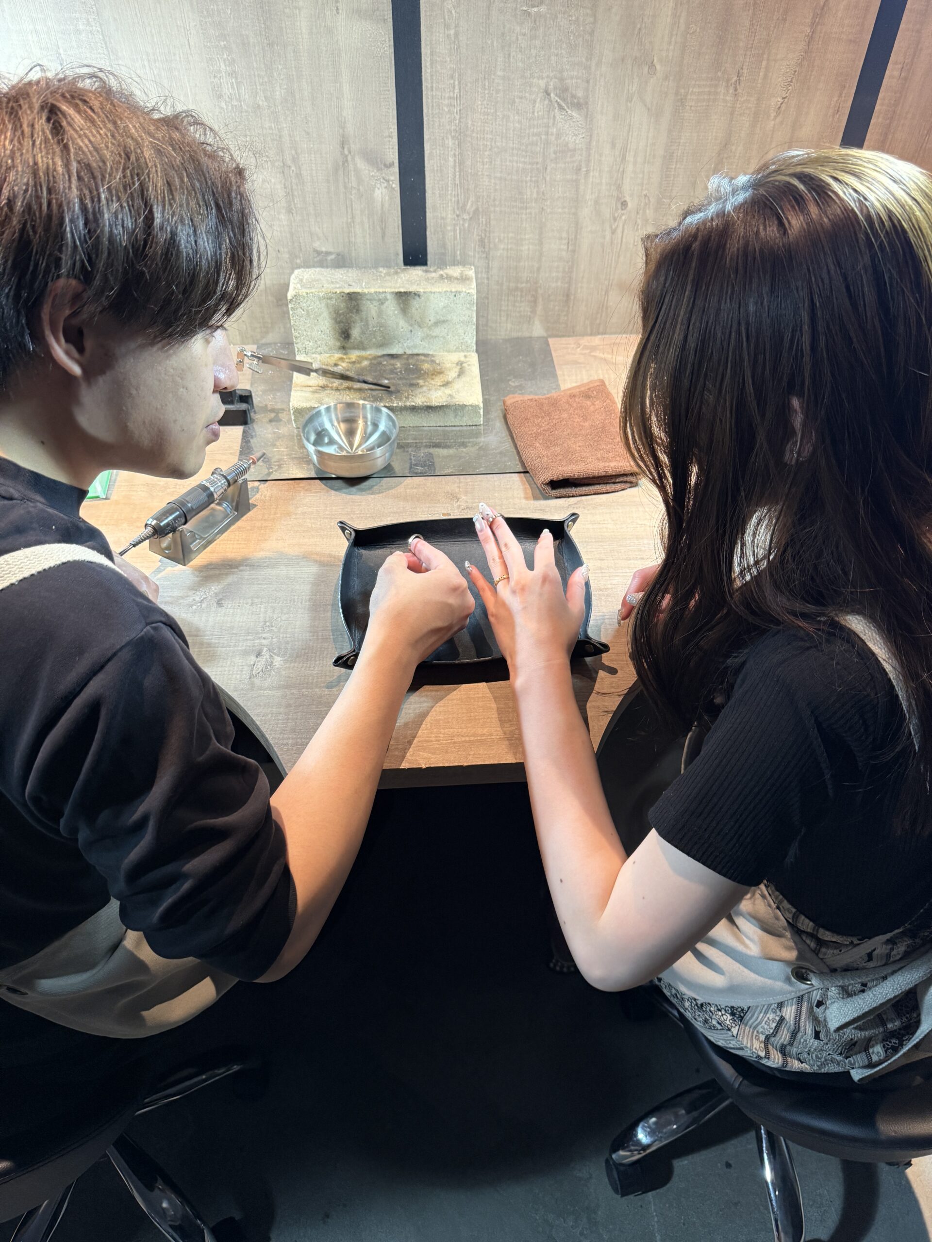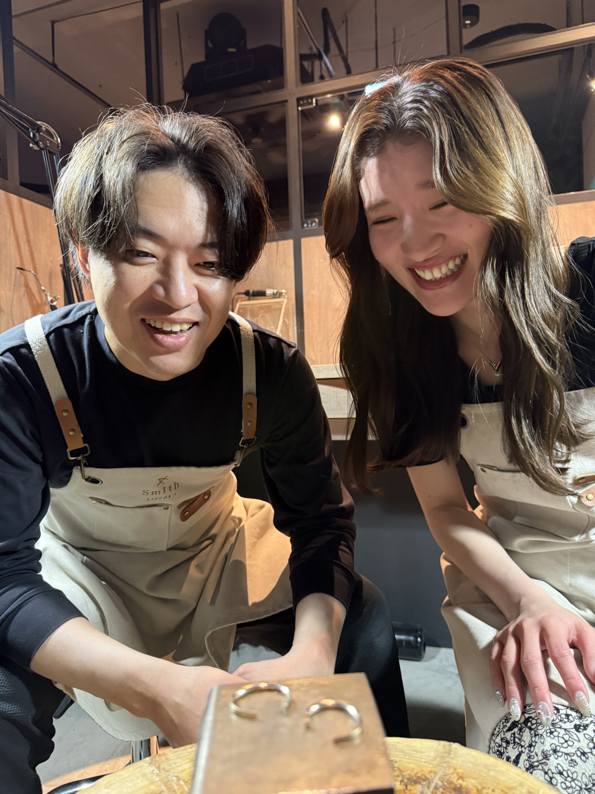 優しい雰囲気でスタイリッシュなお二人は、お打ち合わせから終始和やか。ご制作では職人肌のご主人と明るく一生懸命な奥様の息の合った作業がとても印象的でした。少し緊張気味なスタートでしたが丁寧に作業を進め、完成した指輪はお二人らしくおしゃれで綺麗な仕上がりになりましたね。