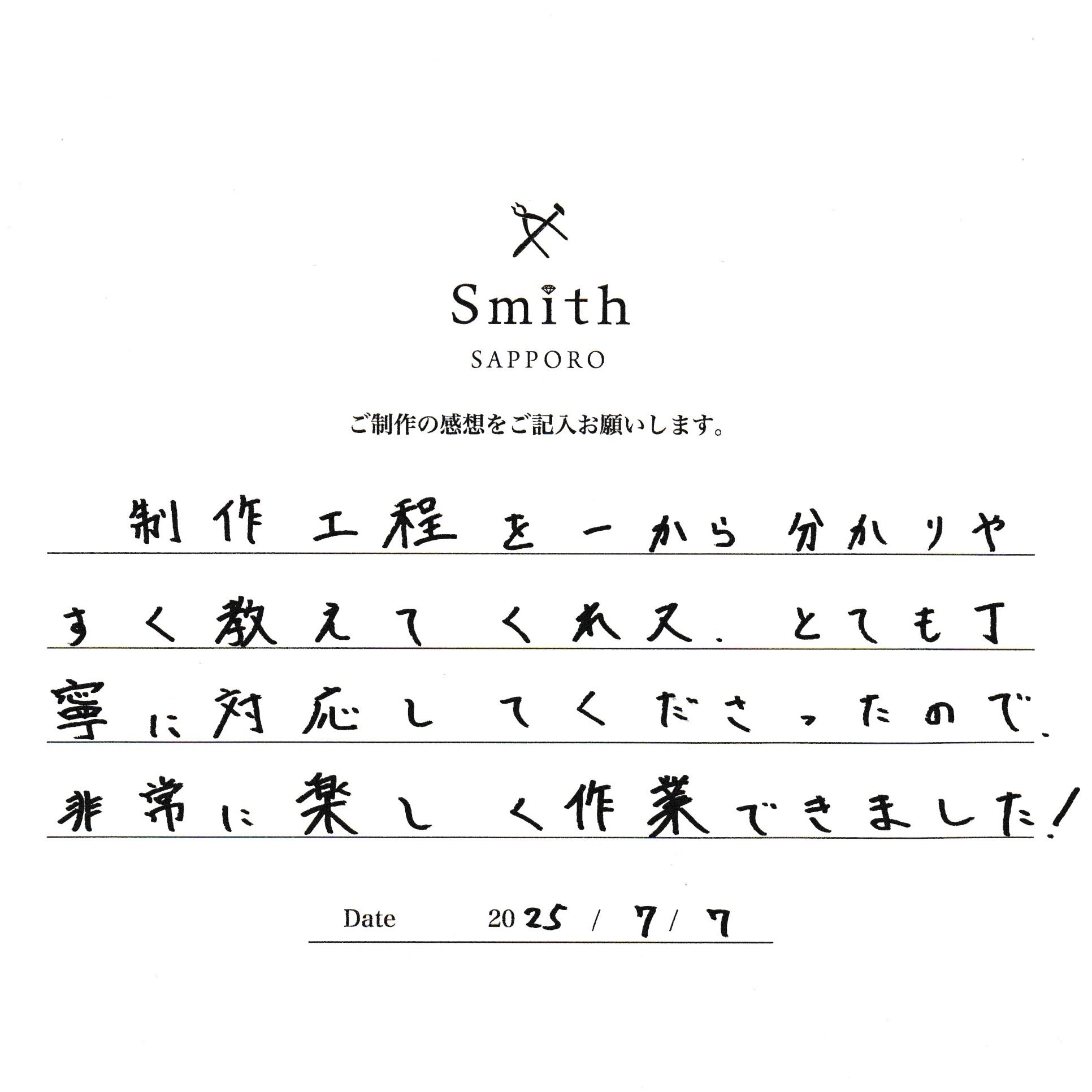 制作工程を一から分かりやすく教えてくれ、またとても丁寧に対応してくださったので非常に楽しく作業できました!