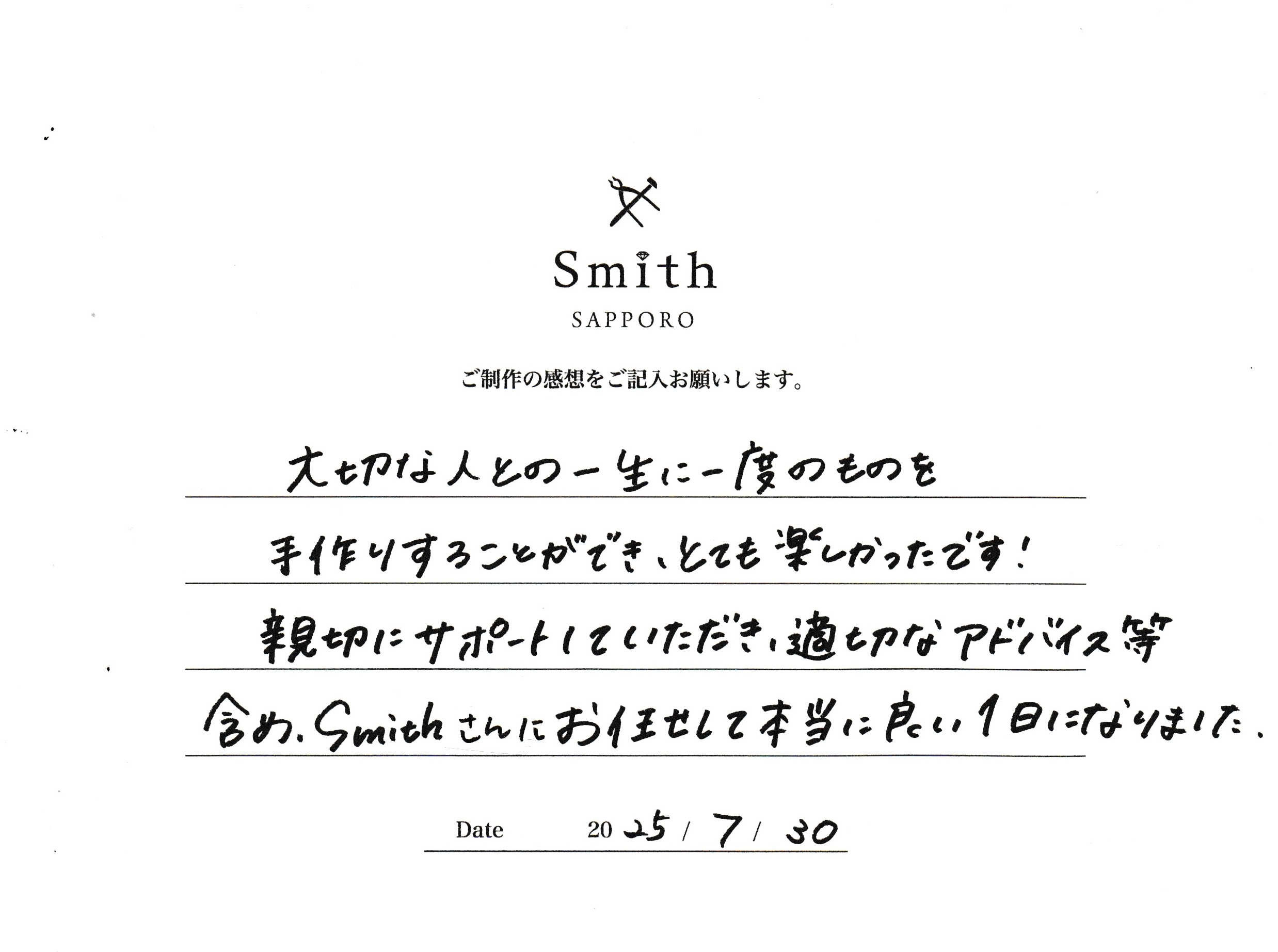この度は、手作り結婚指輪のご制作にご来店頂きまして、誠にありがとうございました。
