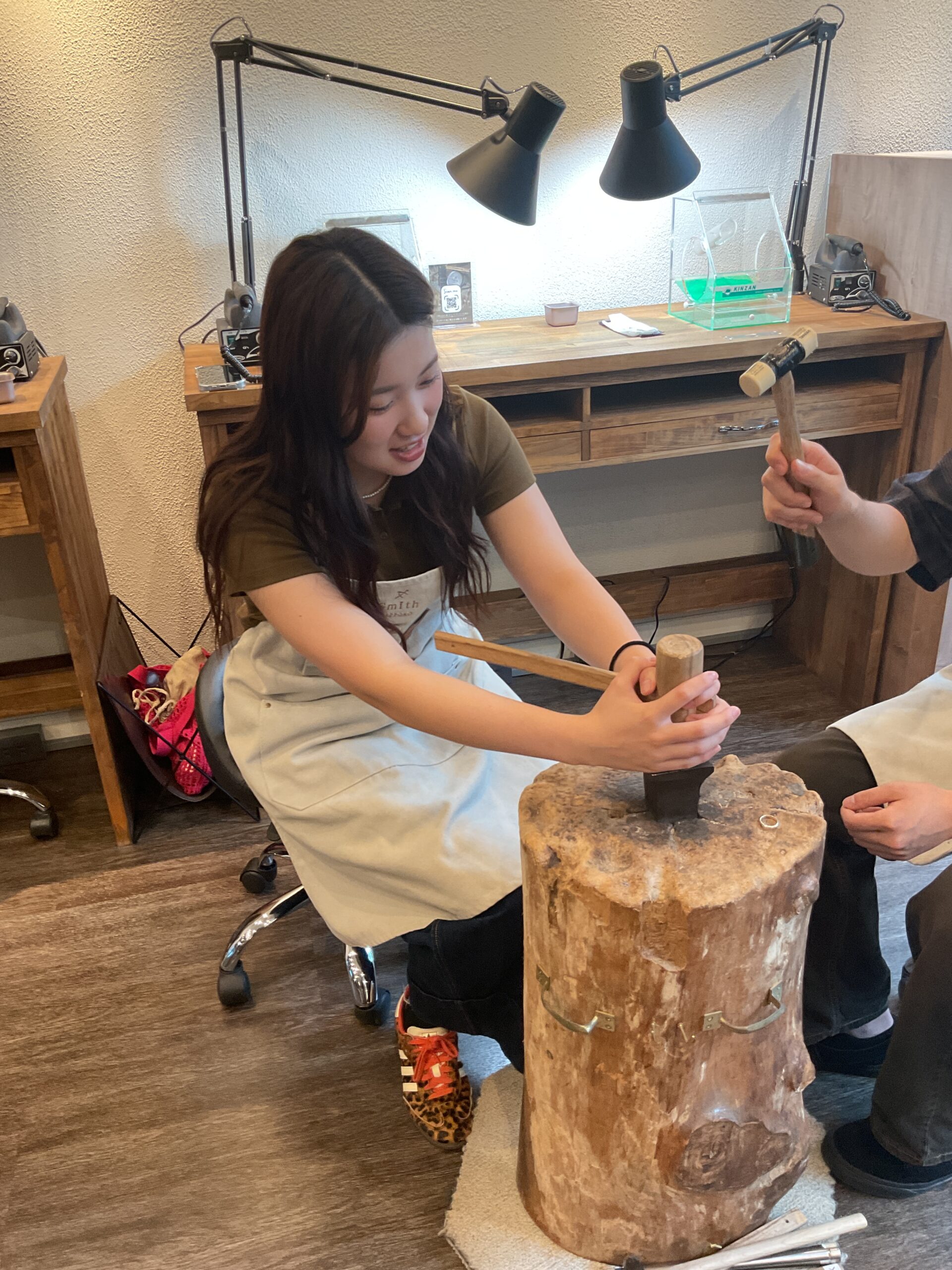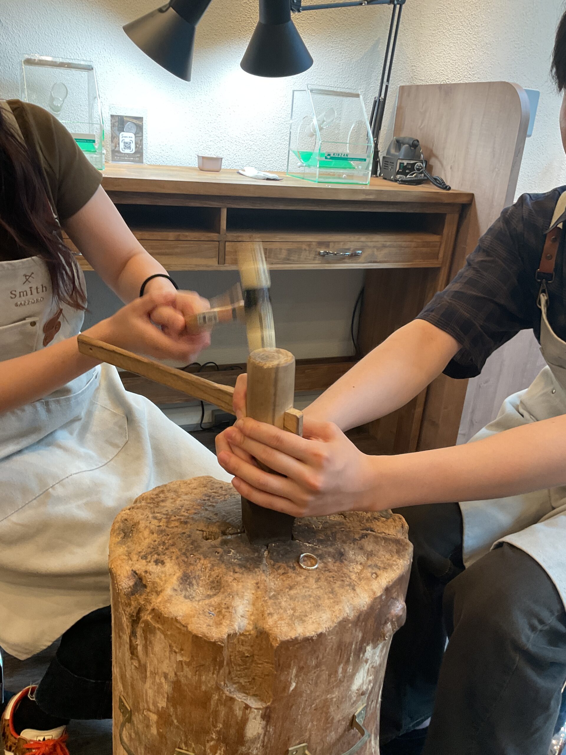 基本の形は3mmの甲丸リングに、テクスチャーは鏡面ハンマーをお選びいただきました。