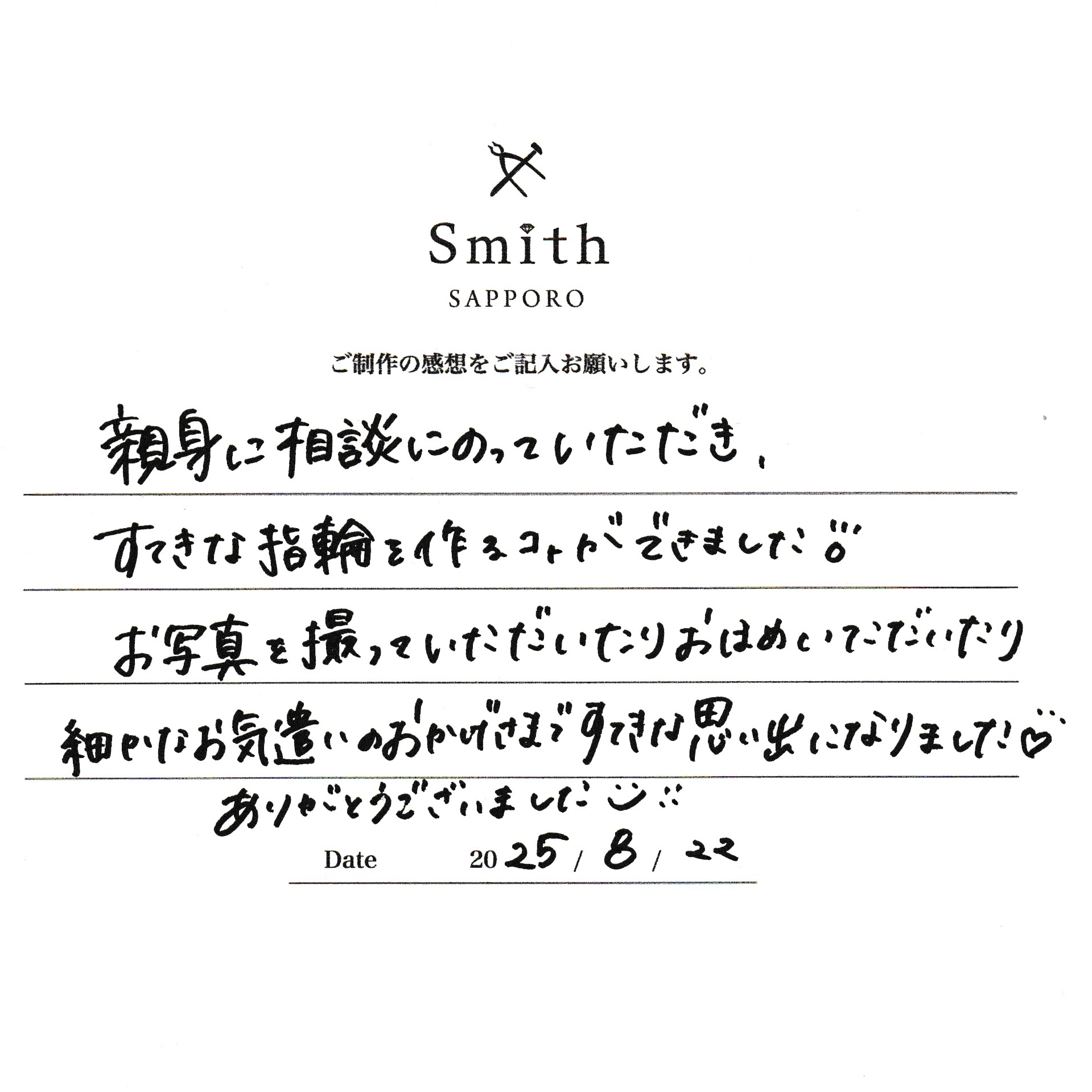 親身に相談に乗っていただき、すてきな指輪を作ることができました。
