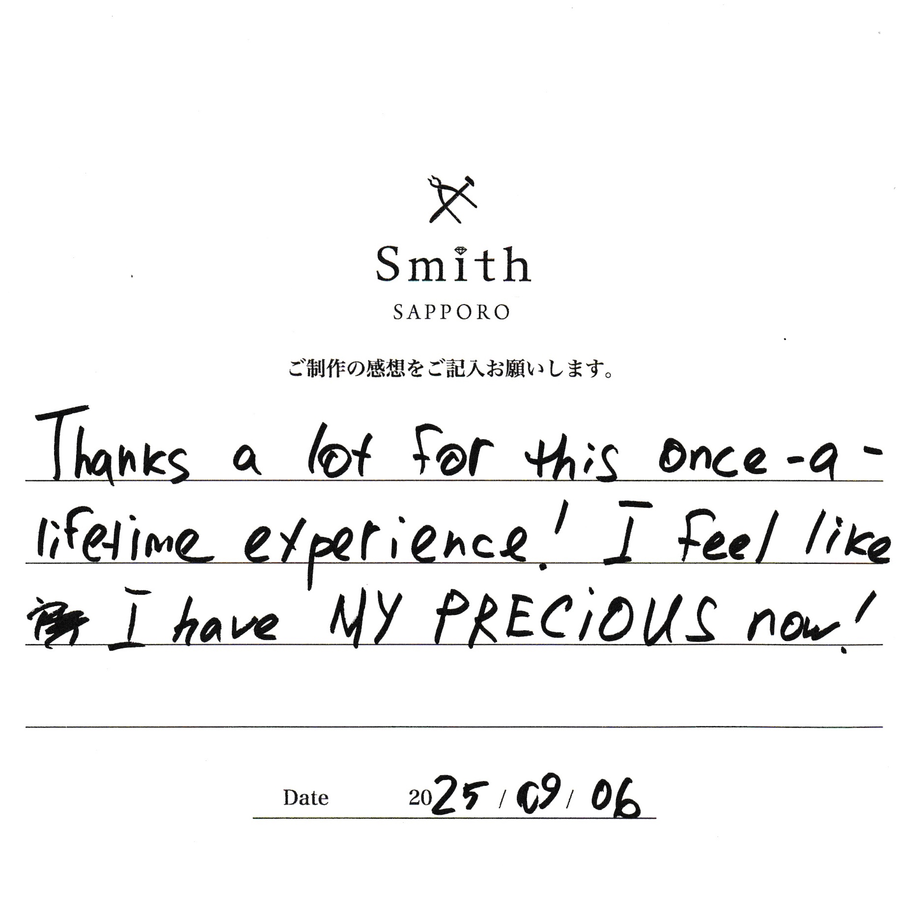 完成した指輪でゴラムのモノマネをしてくださり、私も大笑いで、とても楽しい時間を過ごせました。