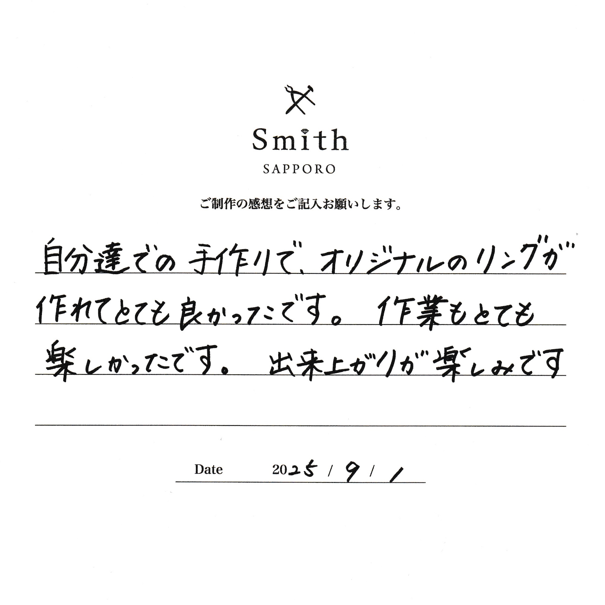 この度は、工房Smith京王プラザホテル札幌店で手作りペアリングのご制作誠にありがとうございました。