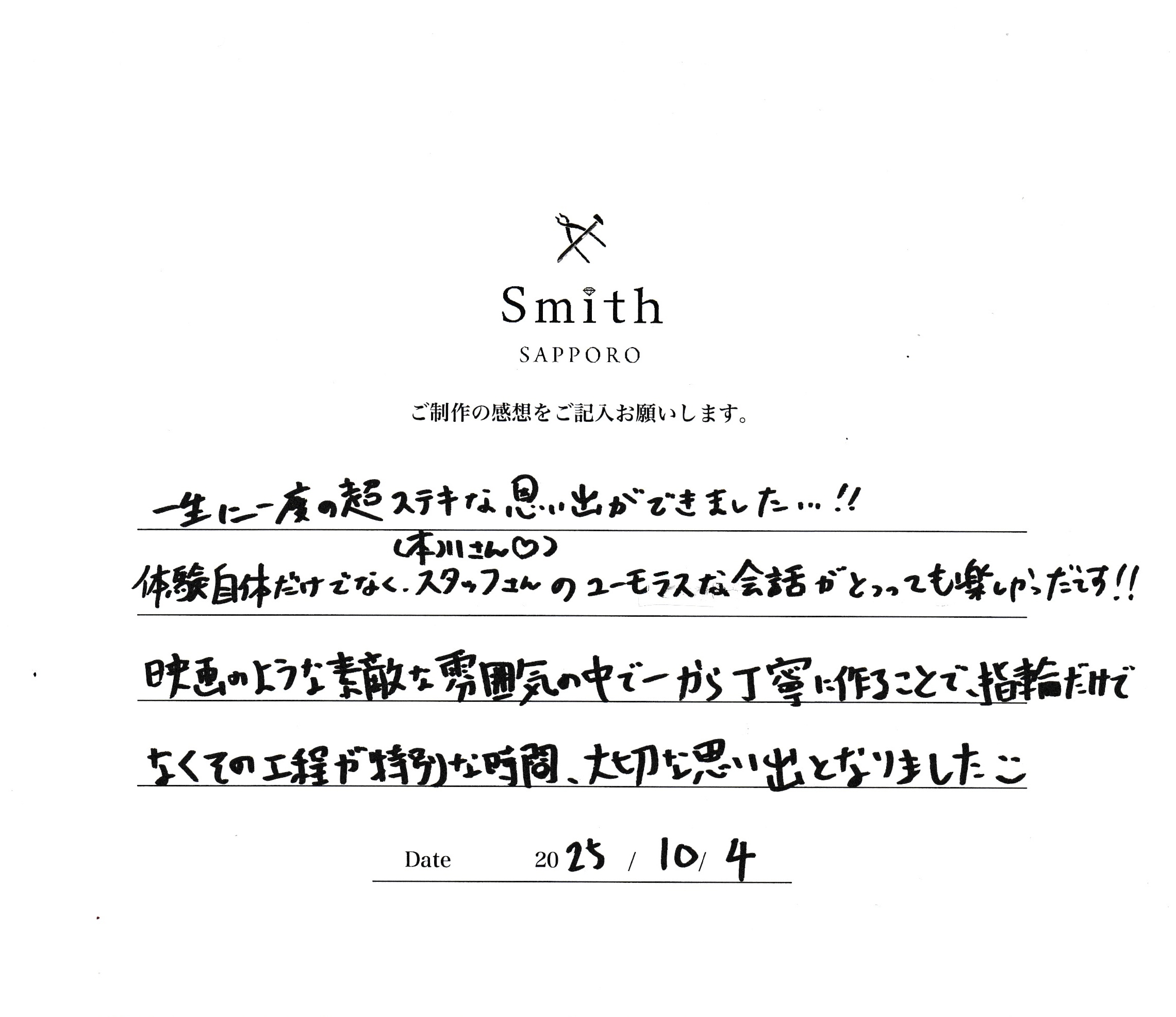 映画のような素敵な雰囲気の中で一から丁寧に作ることで、指輪だけでなくその工程が特別な時間、大切な思い出となりました。