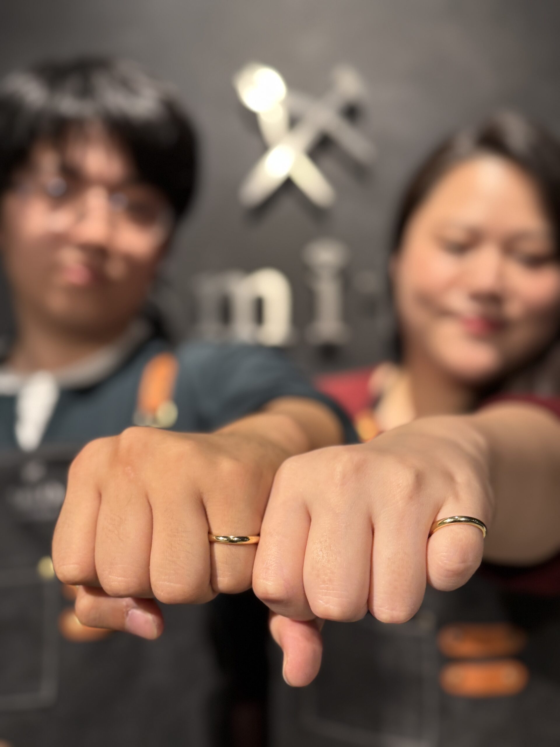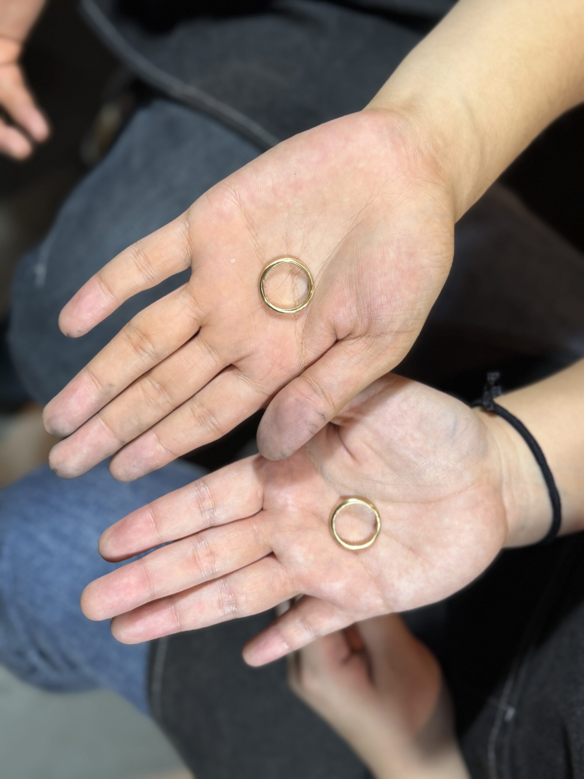制作のすべての工程を楽しんでくださり、完成したイエローゴールドの指輪は、お二人の輝きのように美しい仕上がりとなりました。出来上がりがとても楽しみですね。