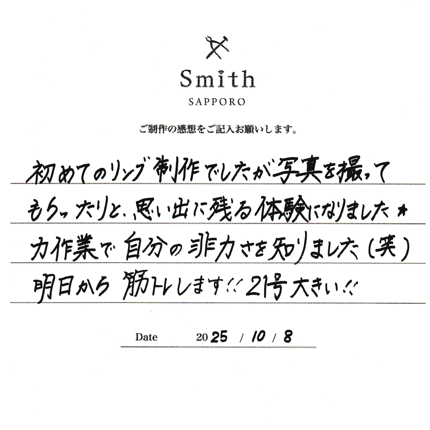 初めてのリング制作でしたが、写真を撮ってもらったりと、思い出に残る体験がになりました。