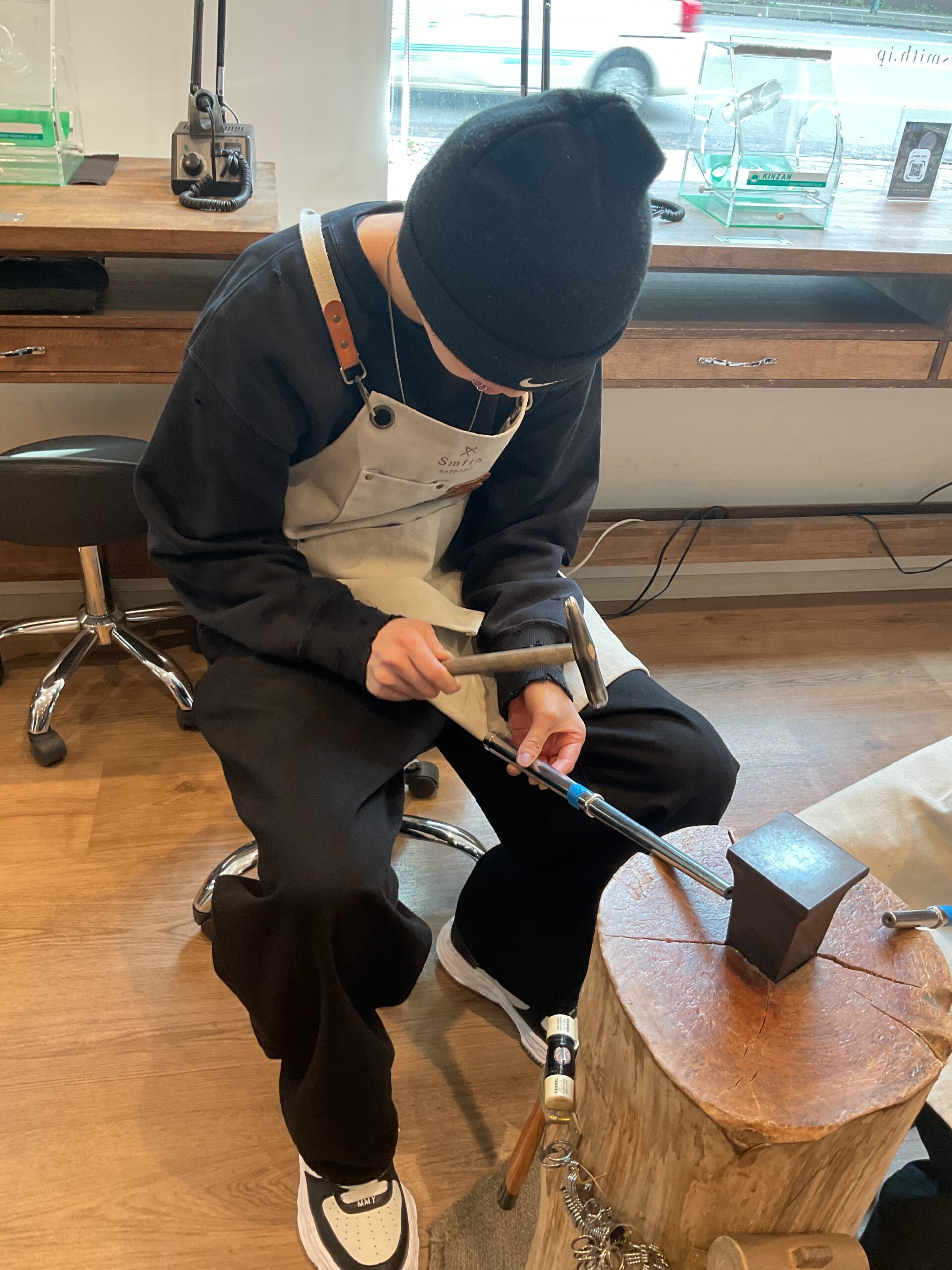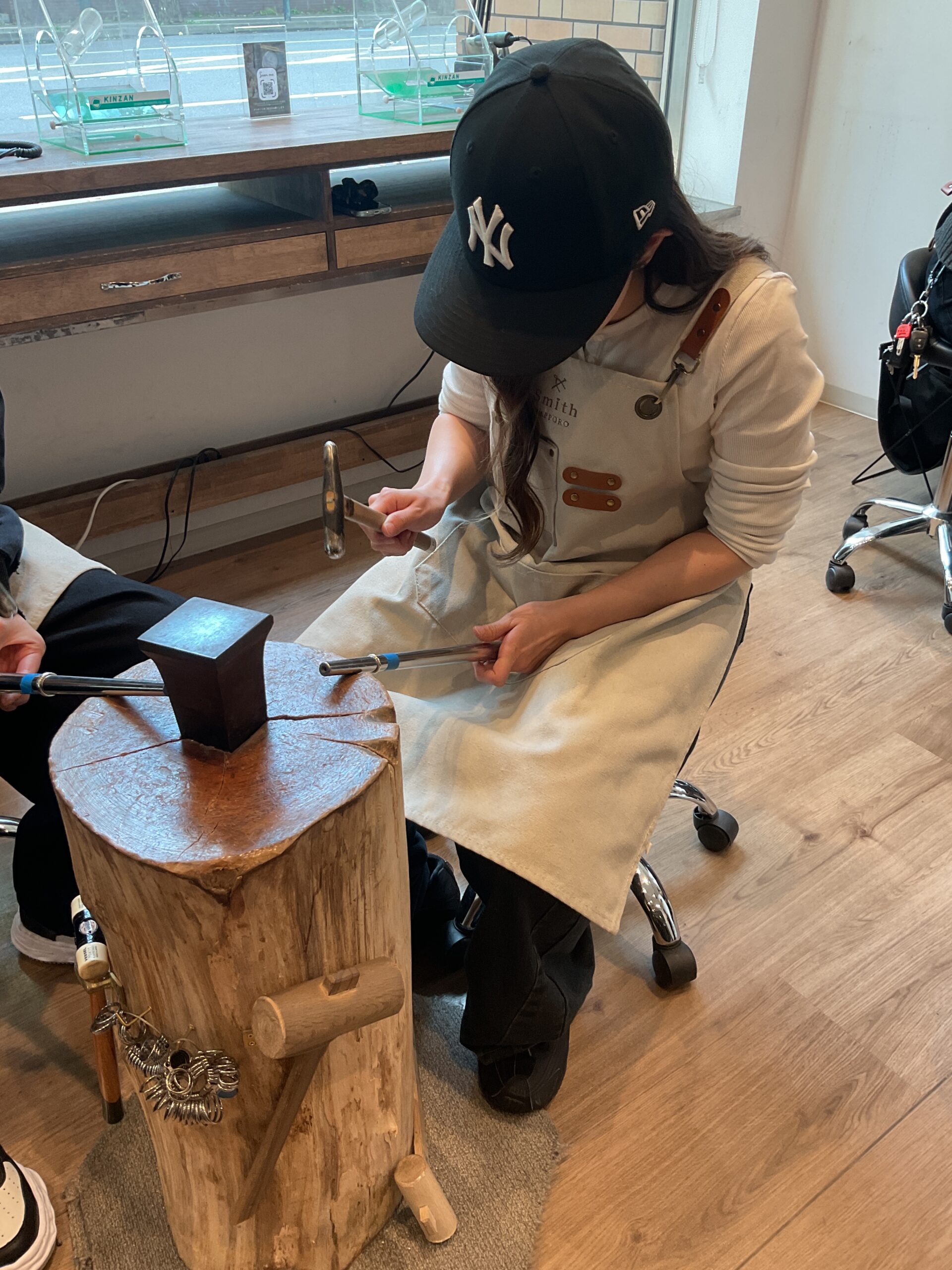基本の形は6mm3mmの甲丸リングに、テクスチャーは鏡面ハンマーをお選びいただきました。