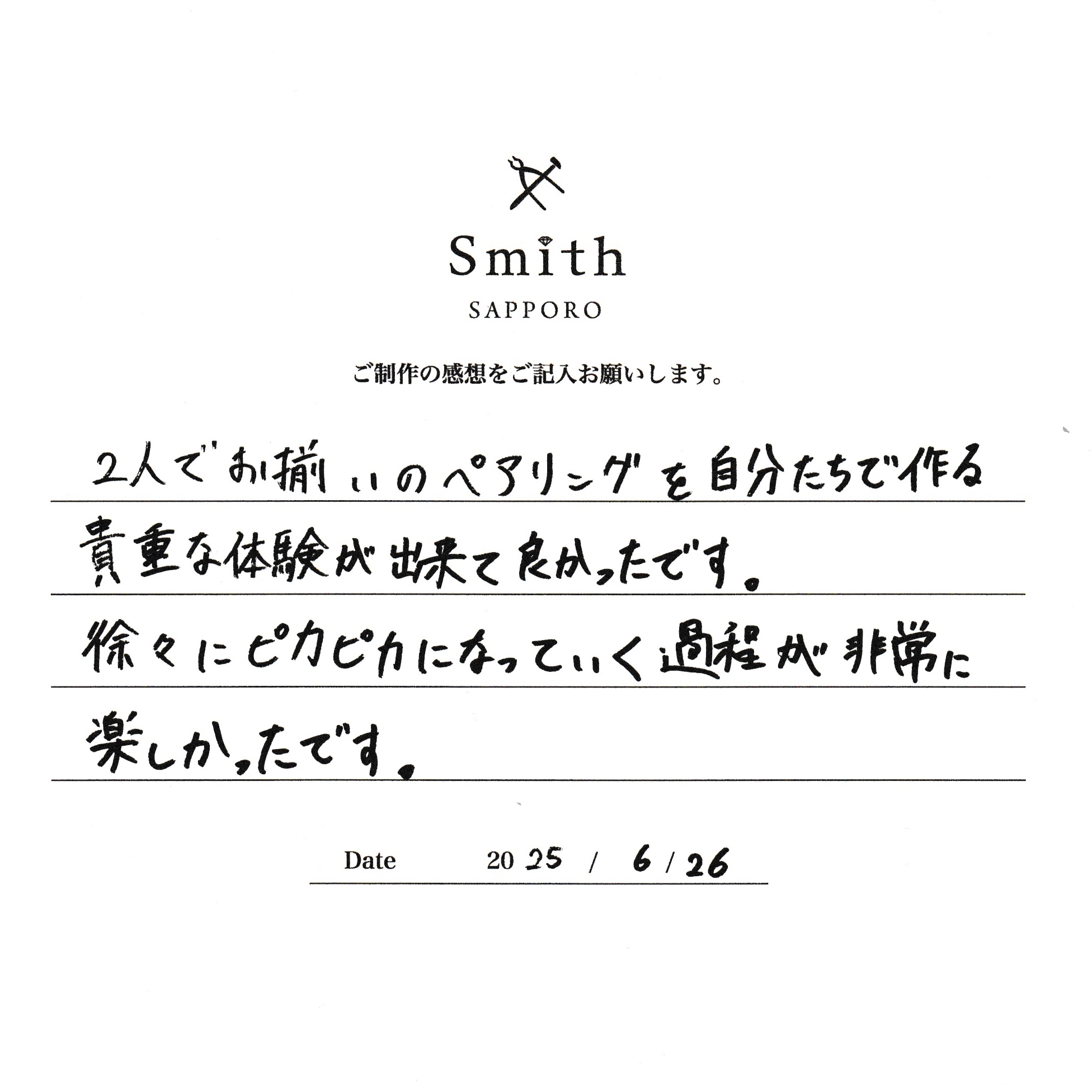 2人でお揃いのペアリングを自分たちで作る貴重な体験ができて良かったです。