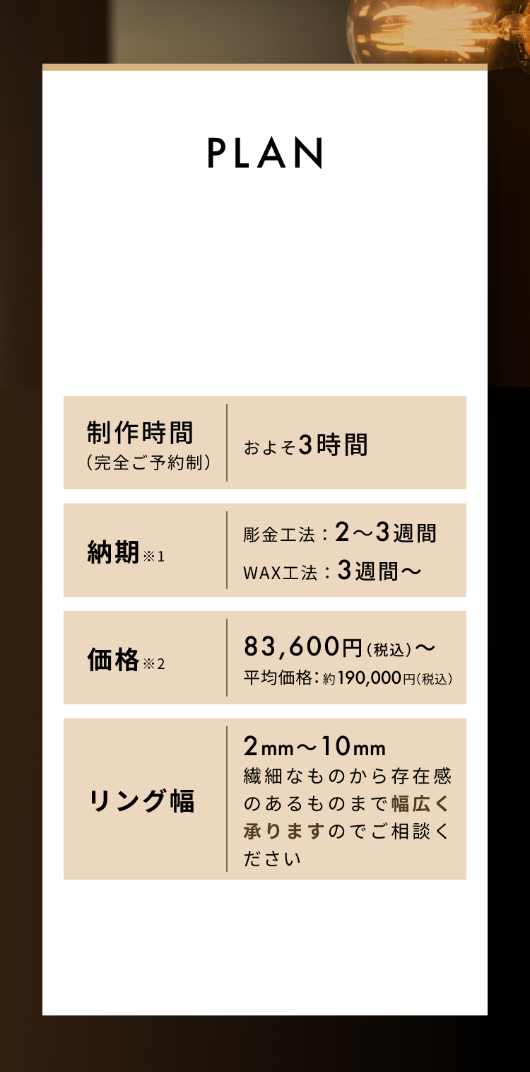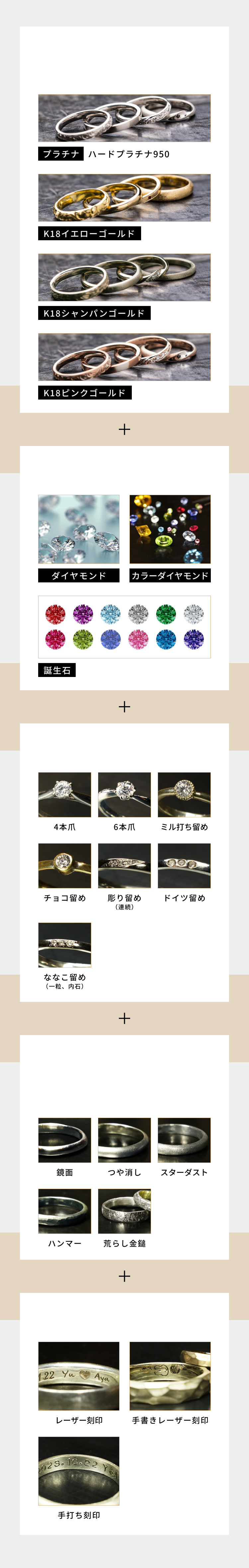 ※1 刻印、石留めなどのオプション加工は、職人が行います。特殊な石枠を追加される場合などは、約1ヶ月のお時間を頂戴しております ※2 貴金属代の重量、金属の相場、オプション加工などにより価格が決まります