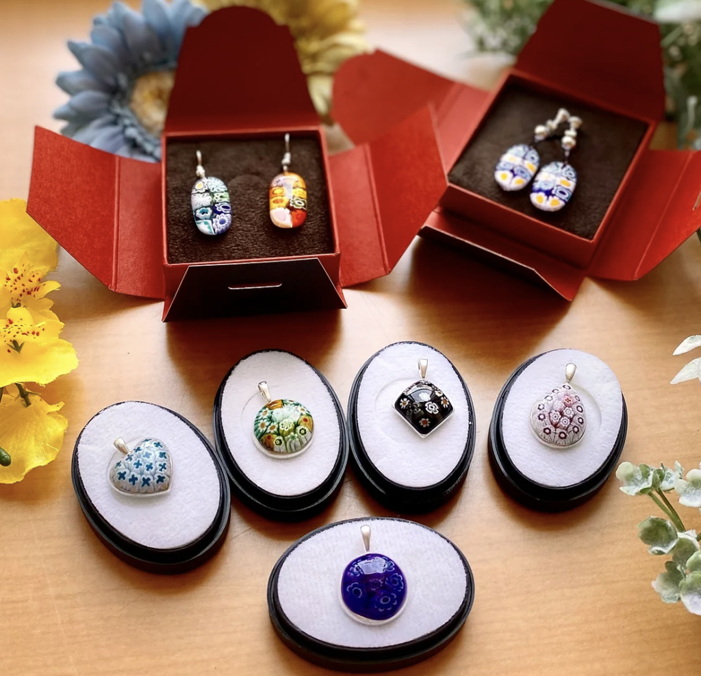 人気の1日体験コースでは、職人の指導のもと、金太郎飴のように模様の入ったミルフィオリガラスを使ったアクセサリーや、炎で溶かしたガラスに模様を施すトンボ玉制作を体験できます。