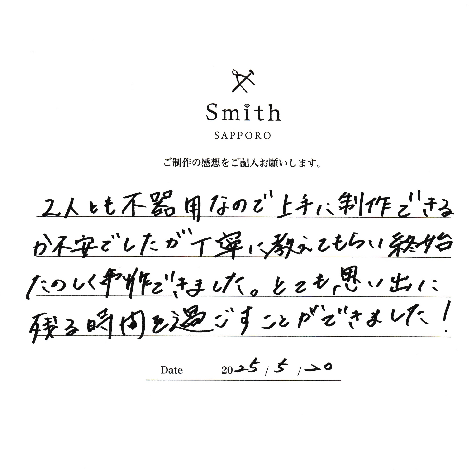 2人とも不器用なので上手に制作できるか不安でしが丁寧に教えてもらい終始楽しく制作できました。