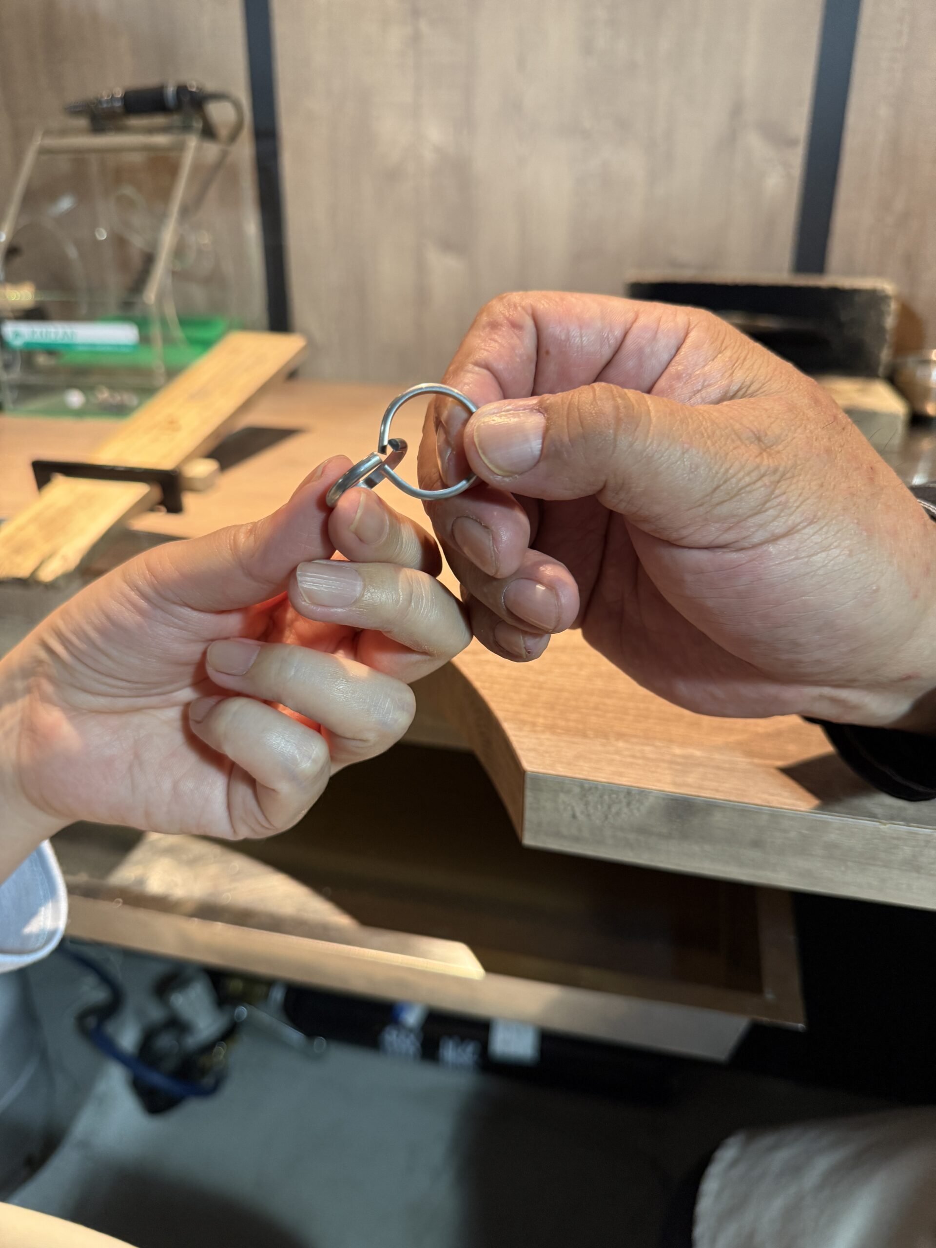お二人で心を込めて作り上げられたプラチナの指輪。お揃いのデザインに、お互いの手で交換して仕上げをされたお姿がとても印象的で、見ている私まで温かな気持ちになりました。