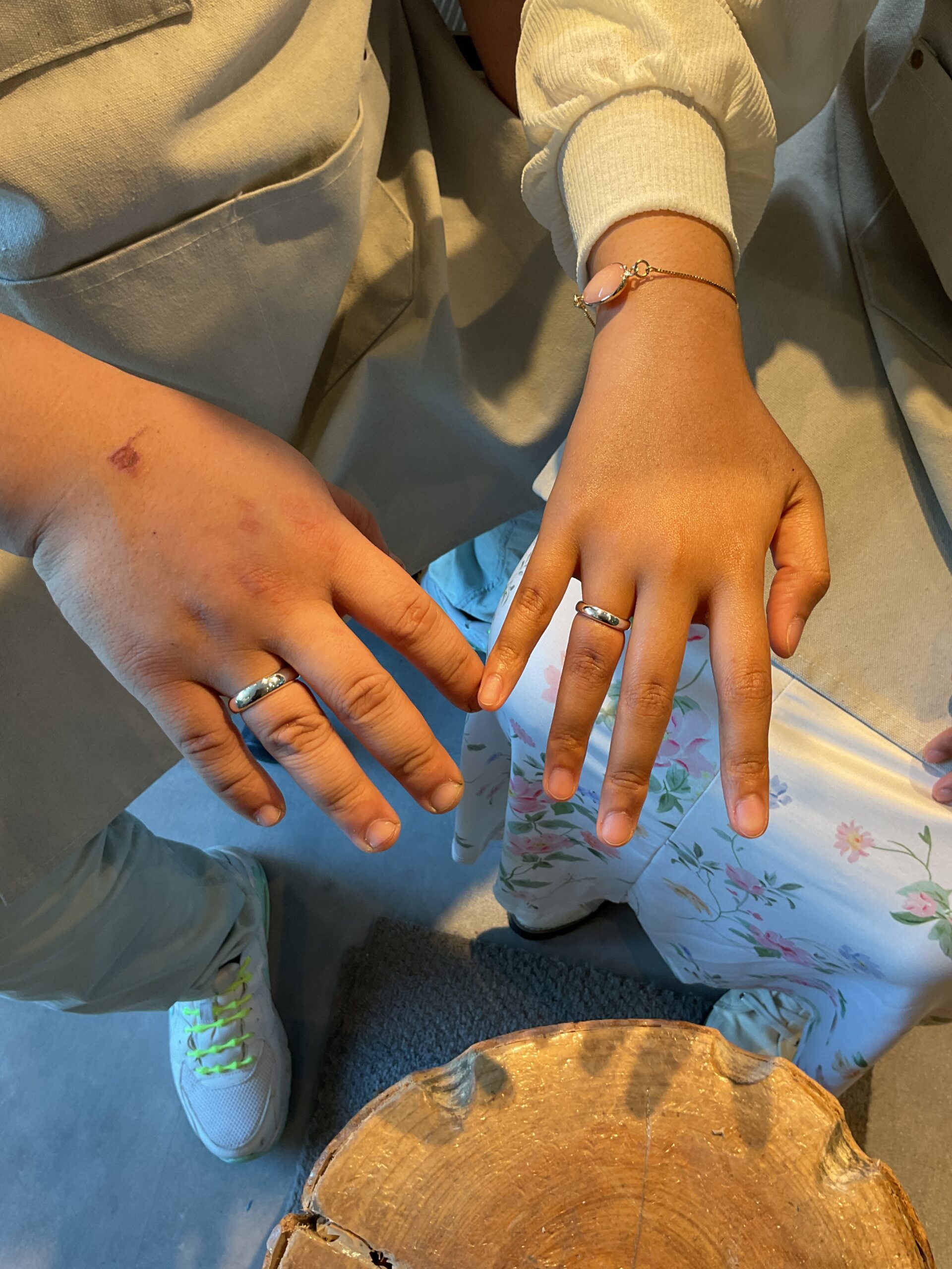 基本の形は4mm 6mmの甲丸リングにテクスチャーは鏡面、デザインは彫り留めをお選びいただきました。