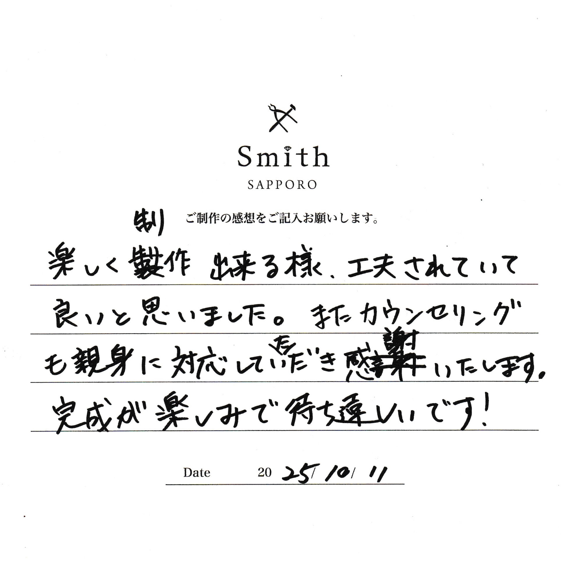 また、デザインにもこだわりをお持ちいただき、大変素敵な指輪が完成したこと、心より嬉しく思っております。