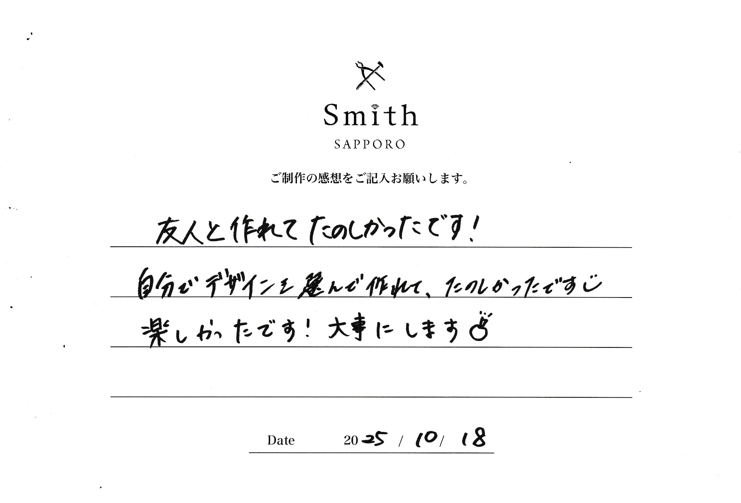 この度は、手作り指輪をご制作いただきまして誠にありがとうございました。
