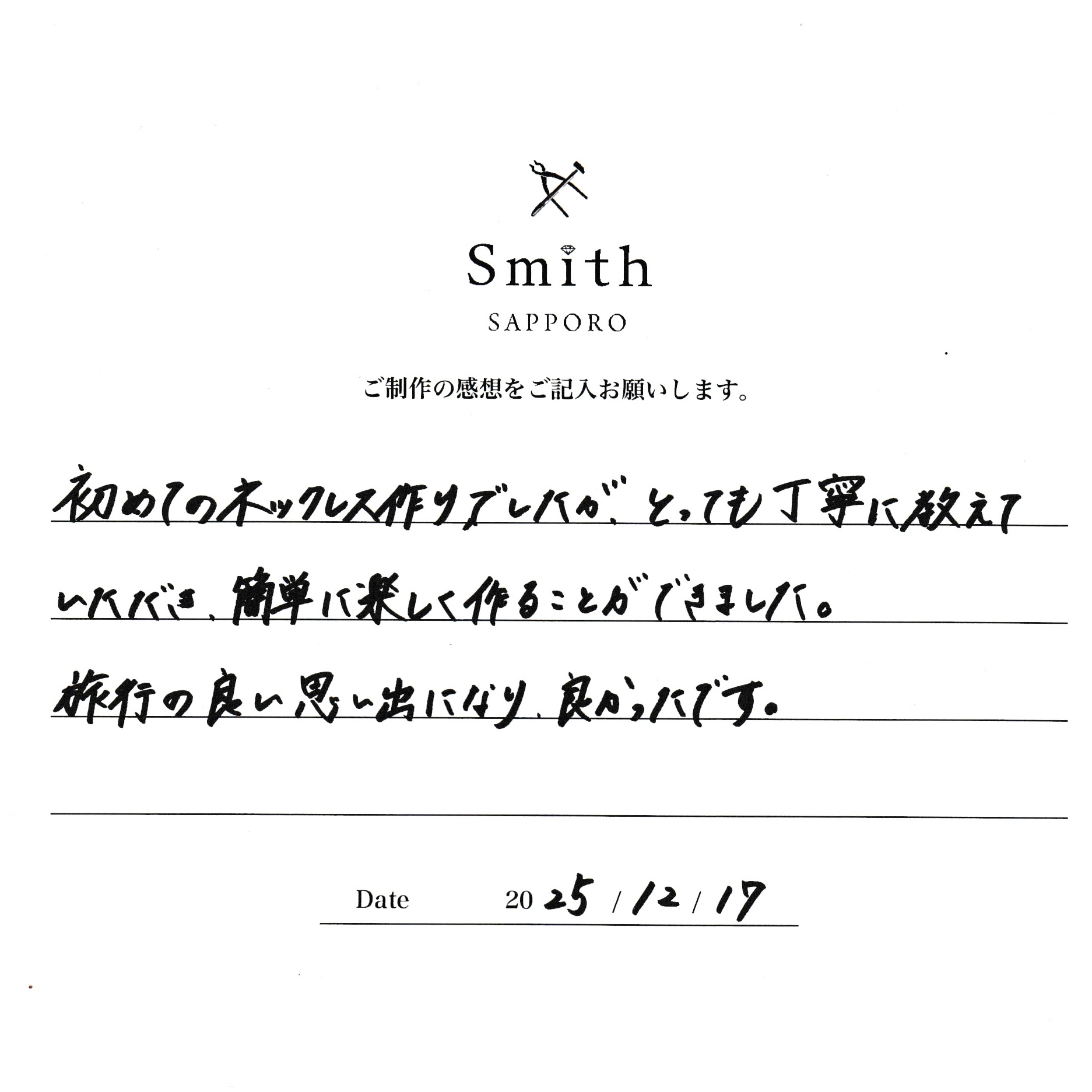 この度は、手作りネックレス制作体験にご来店いただき、誠にありがとうございました。