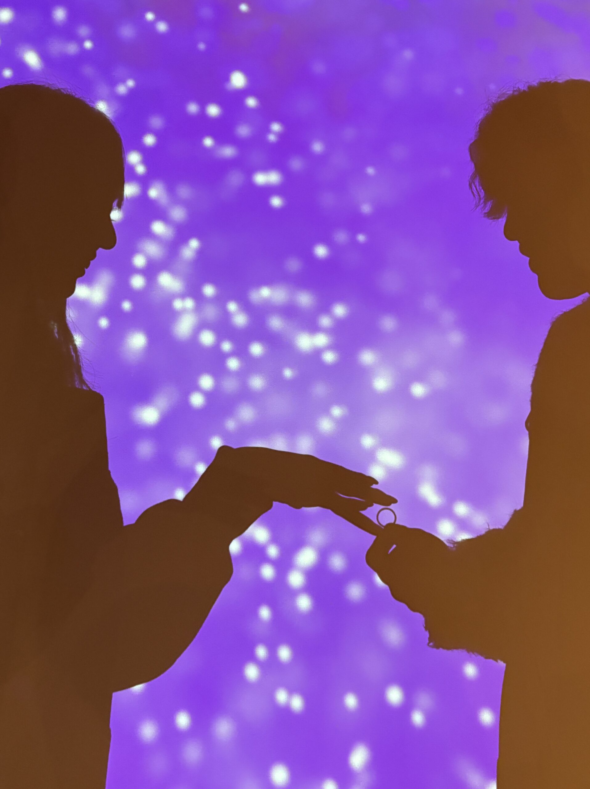 柔らかく優しい雰囲気のお二人が選ばれたのは、お揃いのデザインにそれぞれの誕生石と個性あふれる刻印を添えたリング。