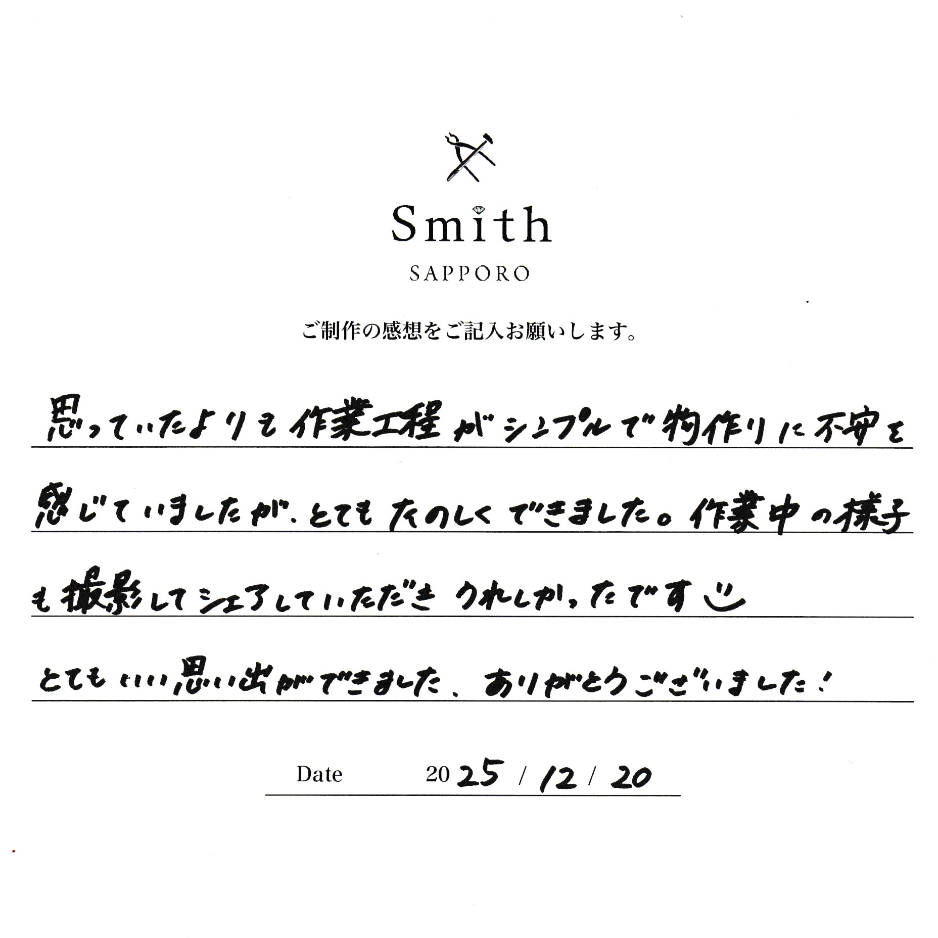 この度は、手作りペアリング制作に来店いただき、誠にありがとうございました。