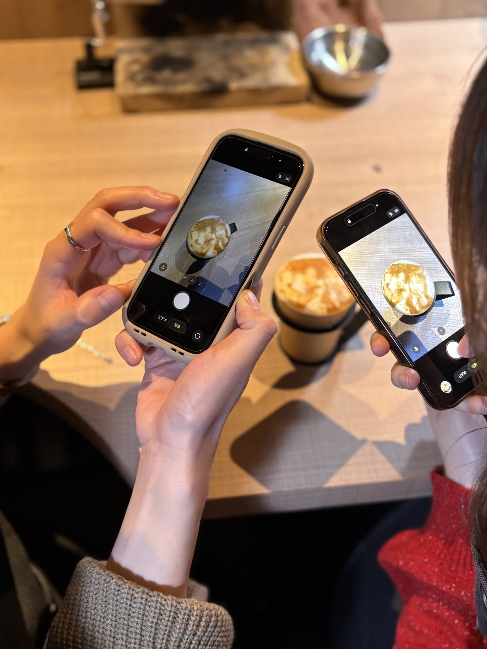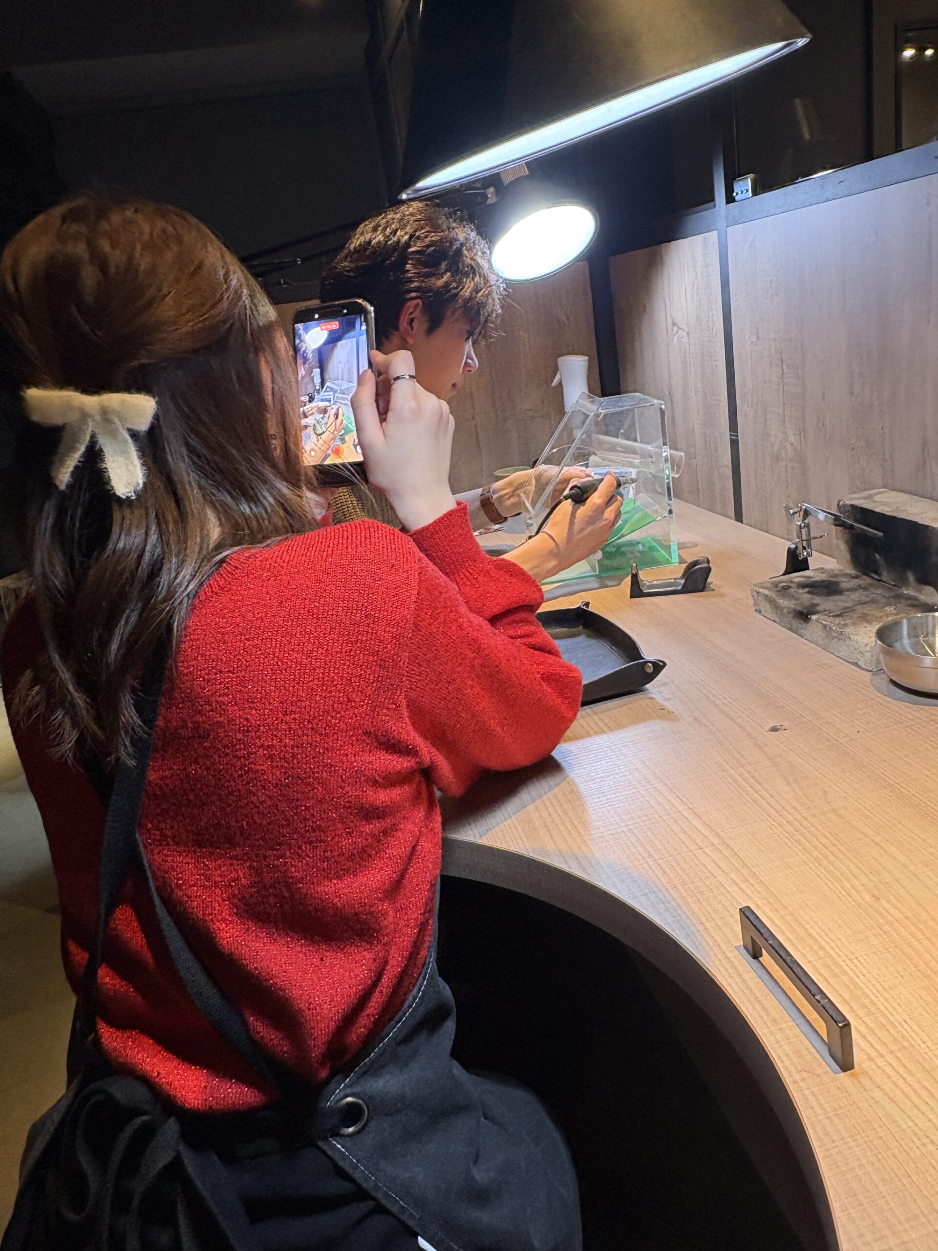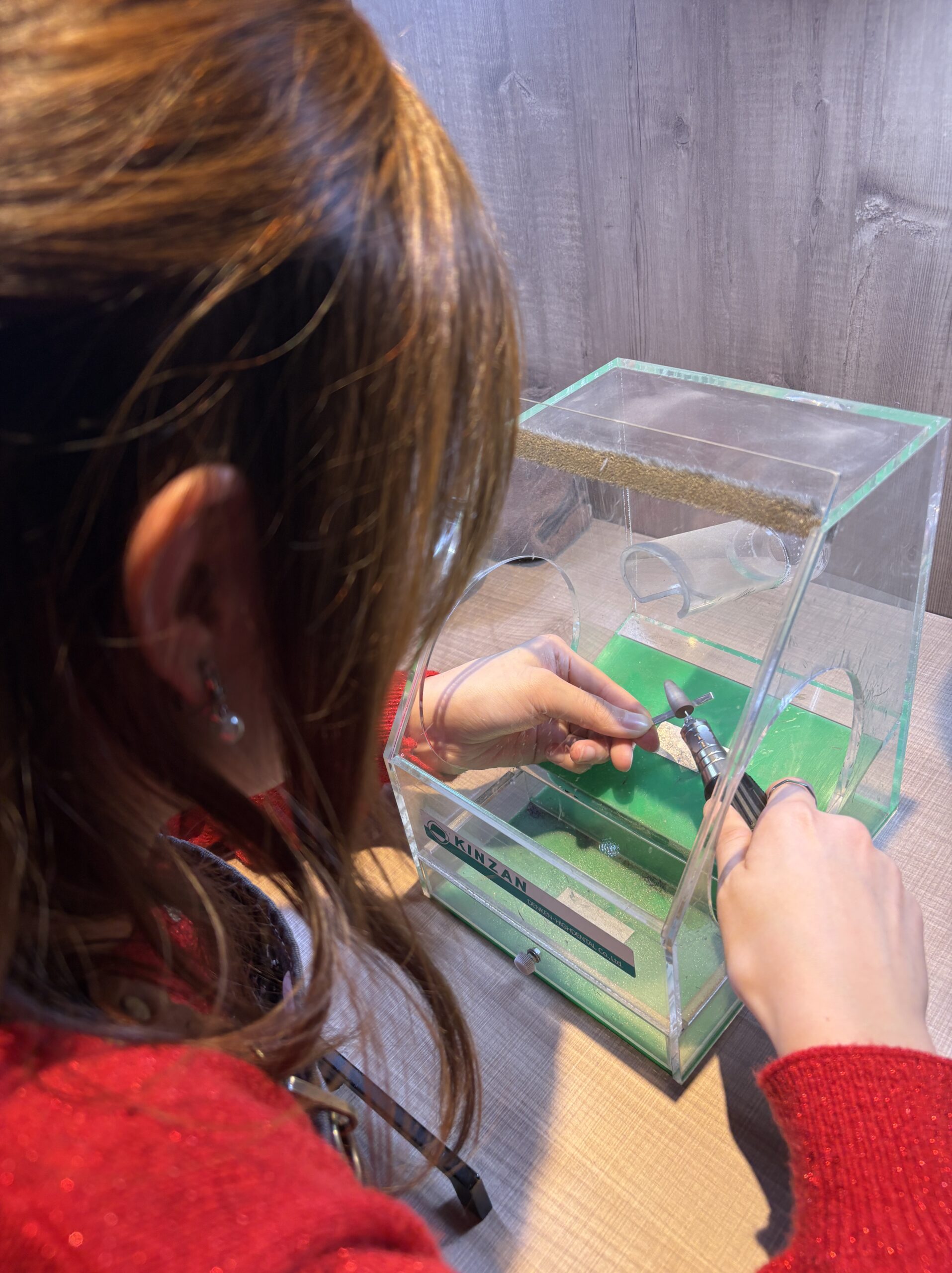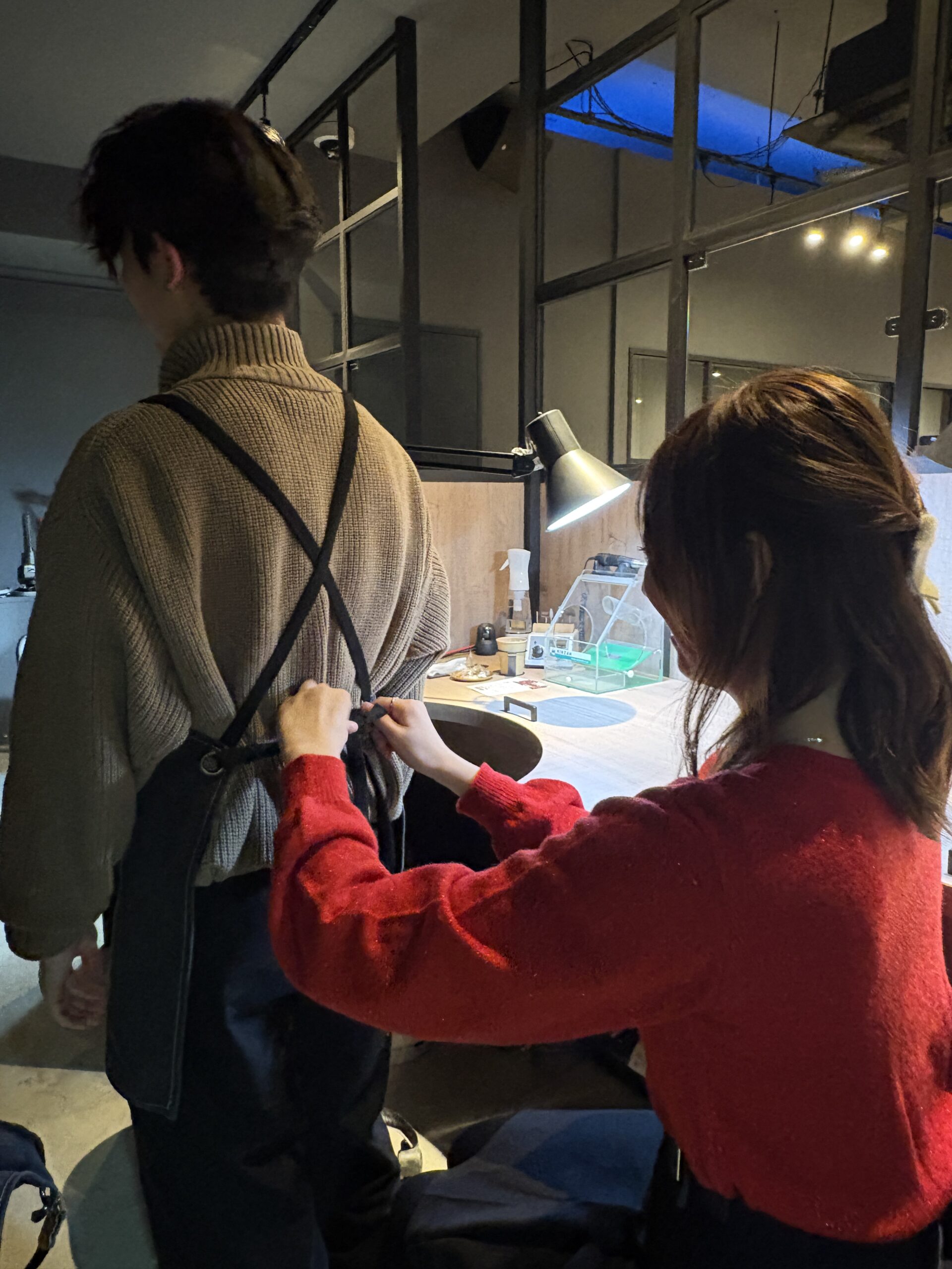 とっても仲の良いお二人でのクリスマス来店、彼女の赤いセーターがとても印象的でした。物腰柔らかく穏やかなお二人。制作中も言葉を交わしながら、お互いのネックレスを作り合う姿から深い信頼感が伝わってきました。異なるデザインながら誕生石を入れ替え、いつもお互いを感じられる素敵なネックレスに。