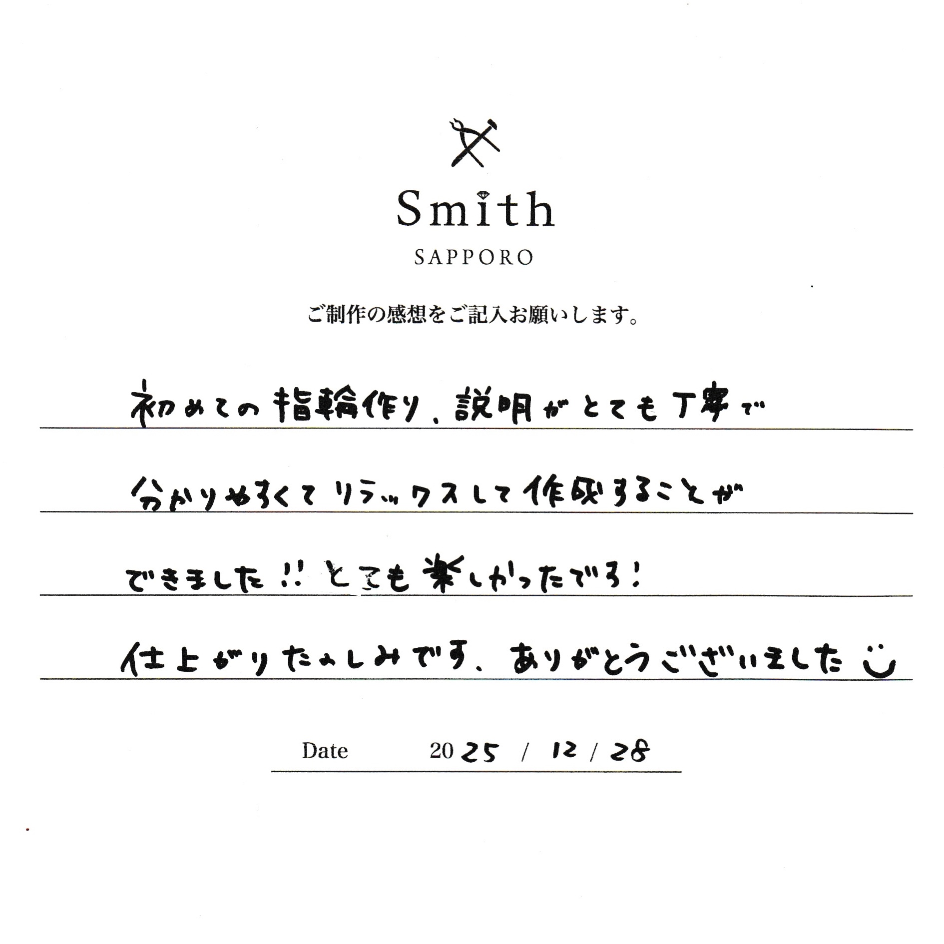 この度は手作り結婚指輪の制作でご来店いただき、誠にありがとうございました。
