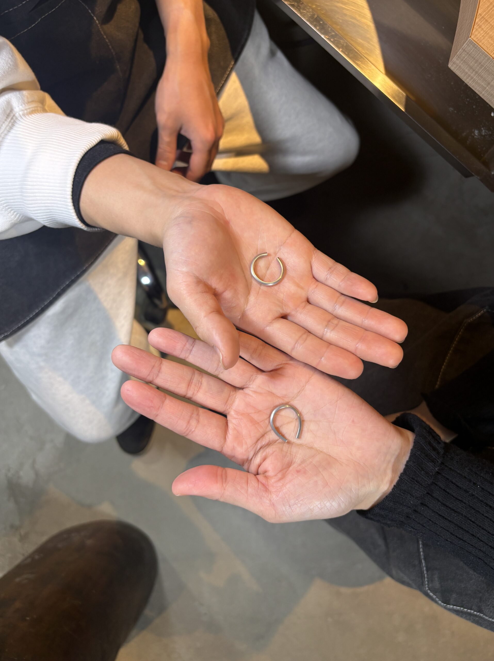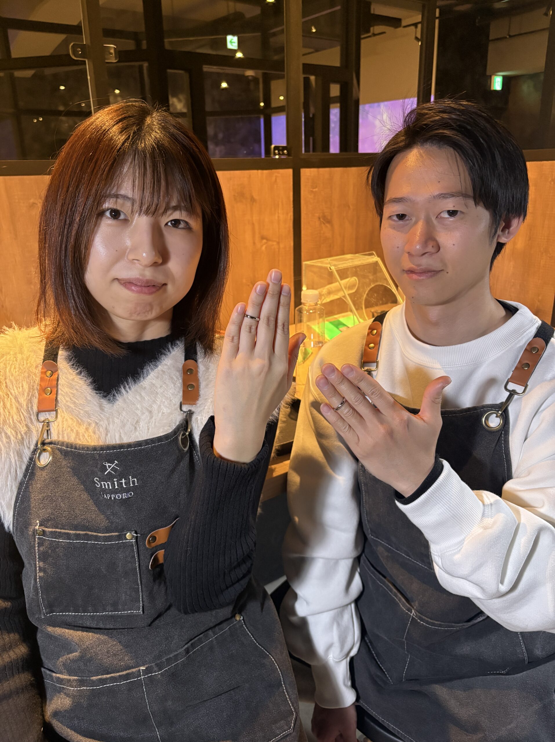 一つ一つの工程を確実にこなされ、終始話し合いながら進める仲の良いお二人の姿がとても印象的でした。完成した指輪は、お二人の誠実さがそのまま表れた、スタイリッシュでとても美しい仕上がりに。