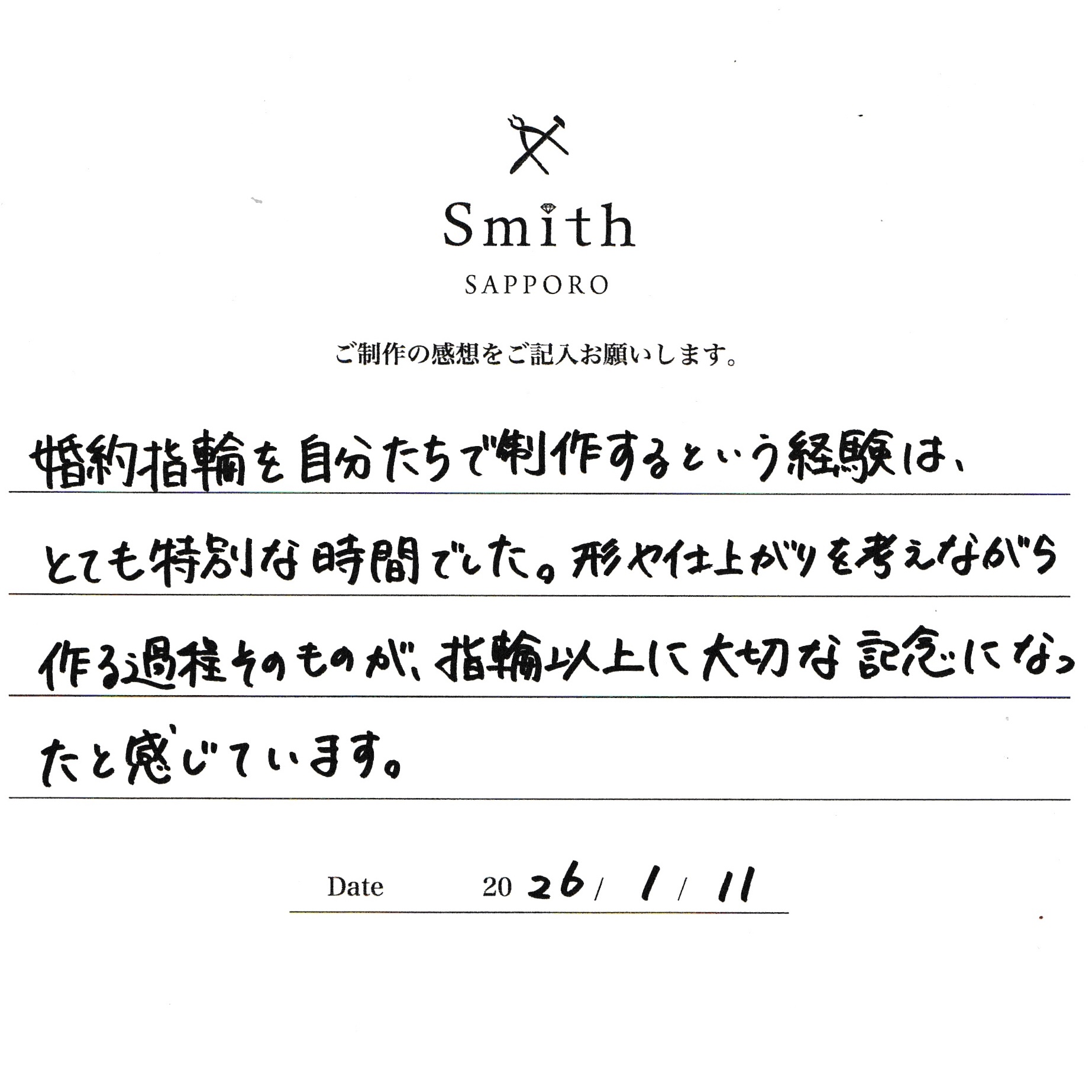 この度は、大切なサプライズダイヤモンドプロポーズの想いを形にする婚約指輪作りに、工房Smith札幌店をお選びいただき、心より感謝申し上げます。