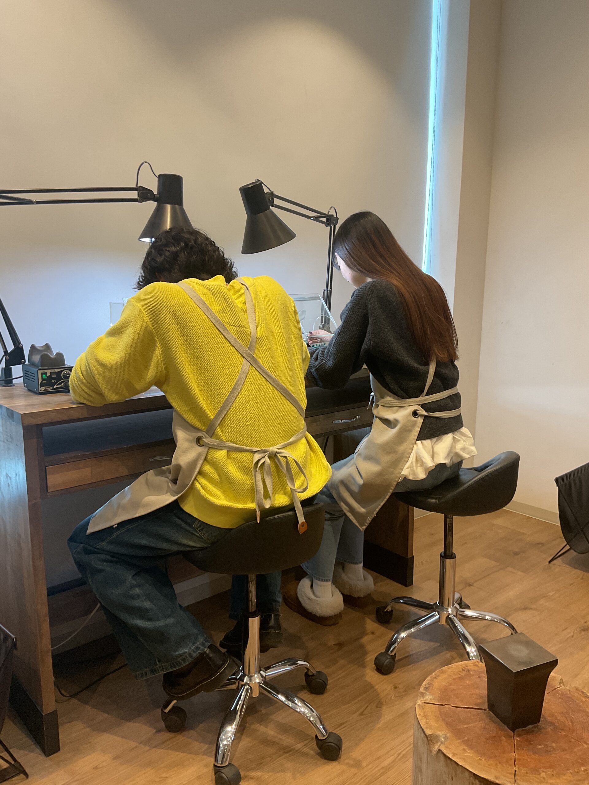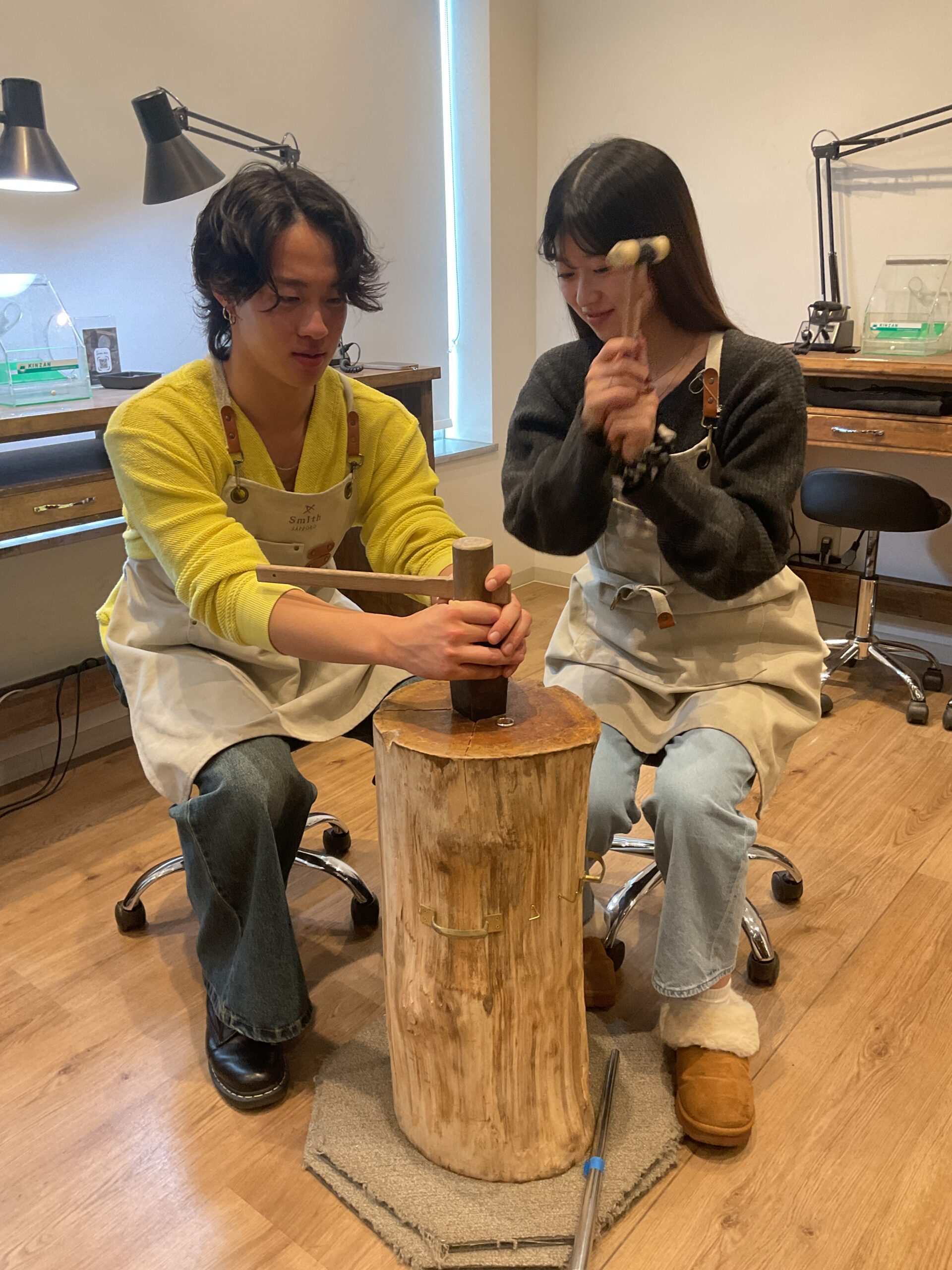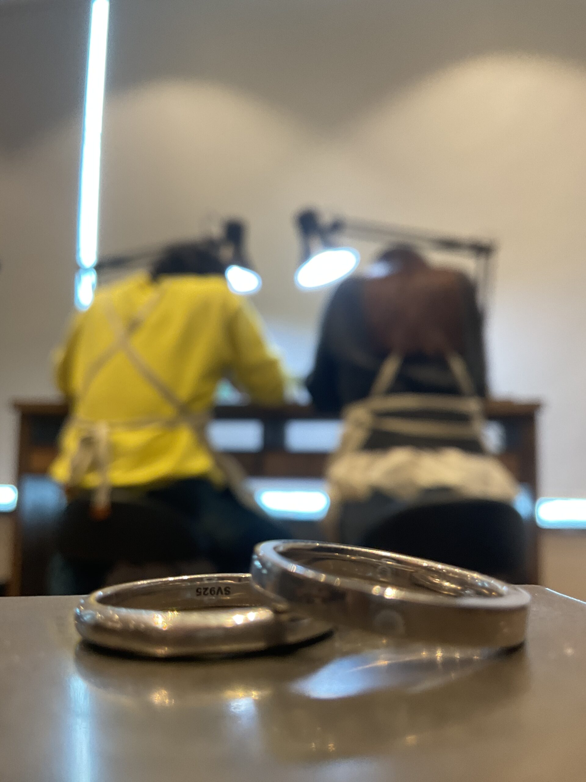 基本の形は3mmと2mmの甲丸リングに、テクスチャーは鏡面ハンマーをお選びいただきました。本日の体験が、完成した指輪を見るたびに当日の楽しさや会話を思い出していただける、かけがえのない時間となっていましたら幸いです。おふたりの末永い幸せを、心よりお祈り申し上げます。