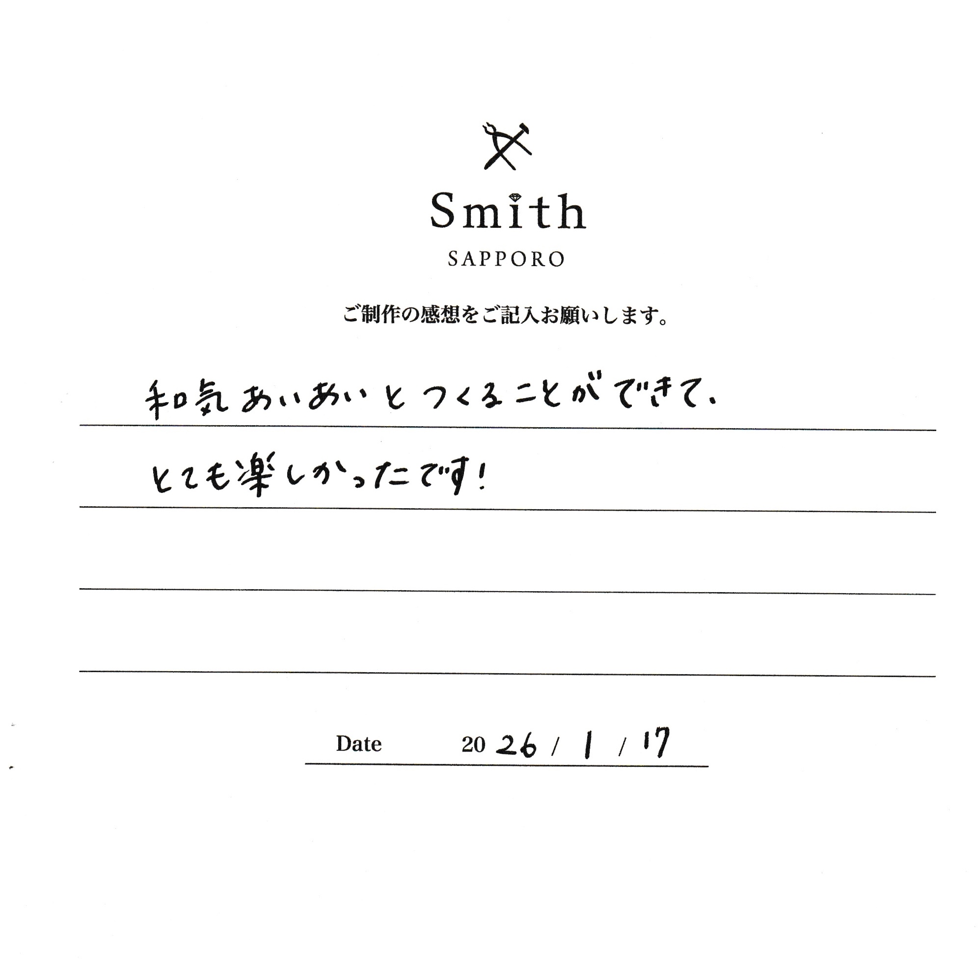 この度は、工房Smith京王プラザホテル札幌店で手作りペアリングのご制作誠にありがとうございました。またのご来店をスタッフ一同、心よりお待ちしております。