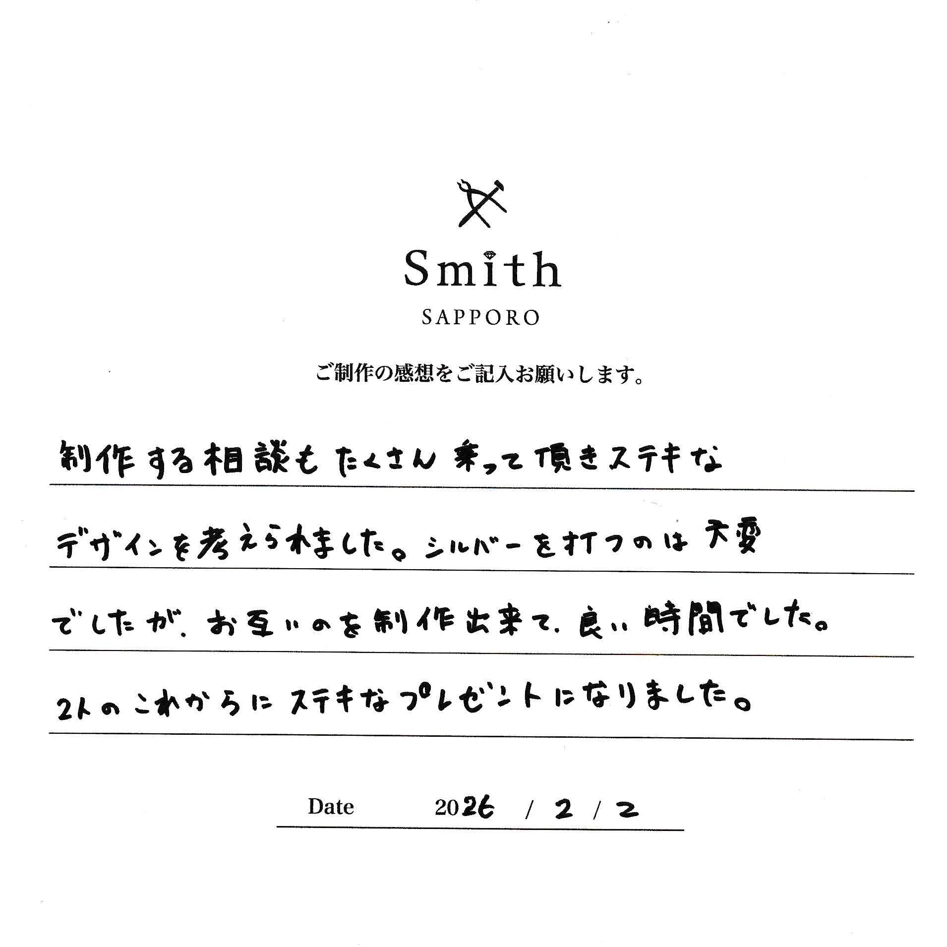 この度はペアリングの制作で工房Smith京王プラザホテル札幌店にご来店いただき、誠にありがとうございました。
