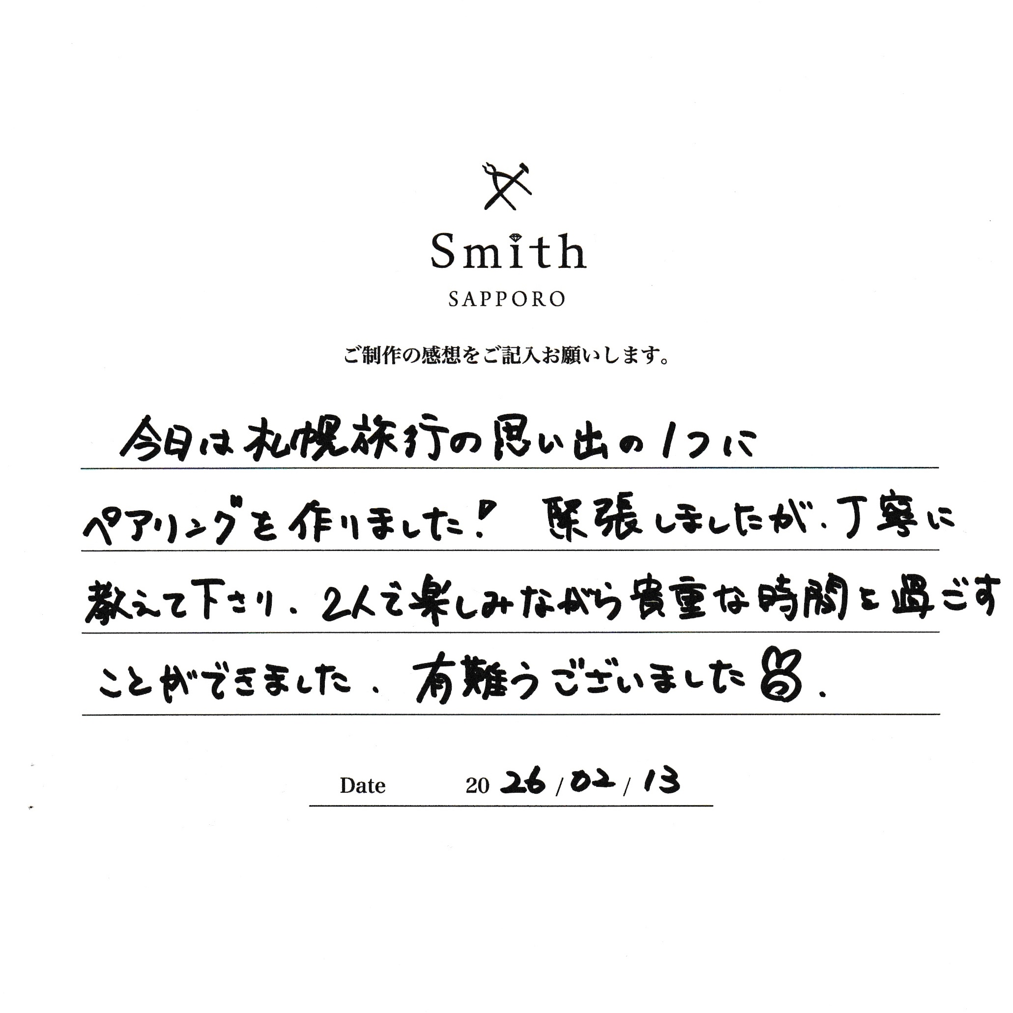 この度はペアリングの制作で工房Smith京王プラザホテル札幌店にご来店いただき、誠にありがとうございました。
