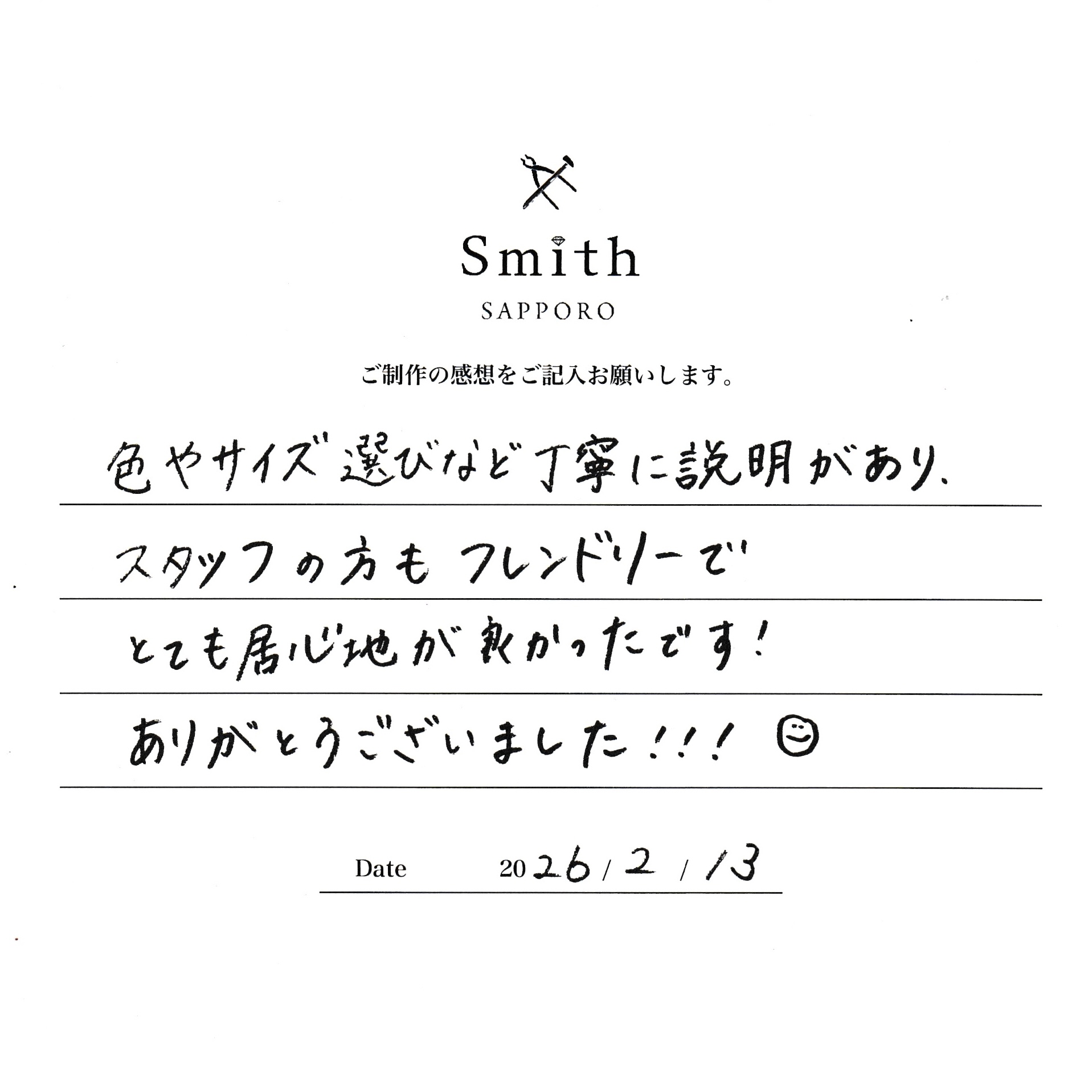 色やサイズ選びなど丁寧に説明があり、スタッフの方もフレンドリーでとても居心地が良かったです!