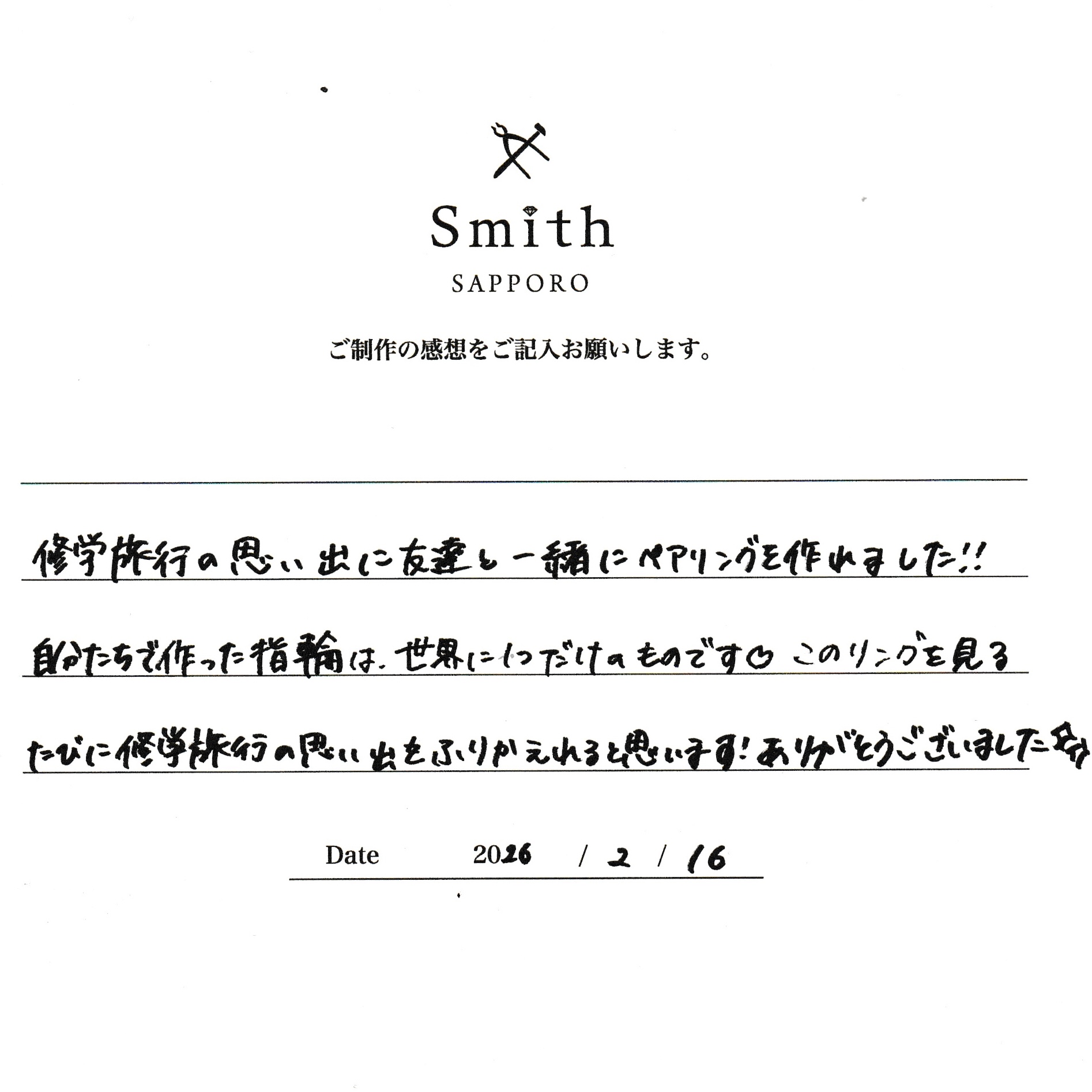 この度はペアリングの制作で工房Smith京王プラザホテル札幌店にご来店いただき、誠にありがとうございました。修学旅行という特別な機会に、ご友人とご一緒にリング制作をお選びいただけましたこと、心より嬉しく思います。