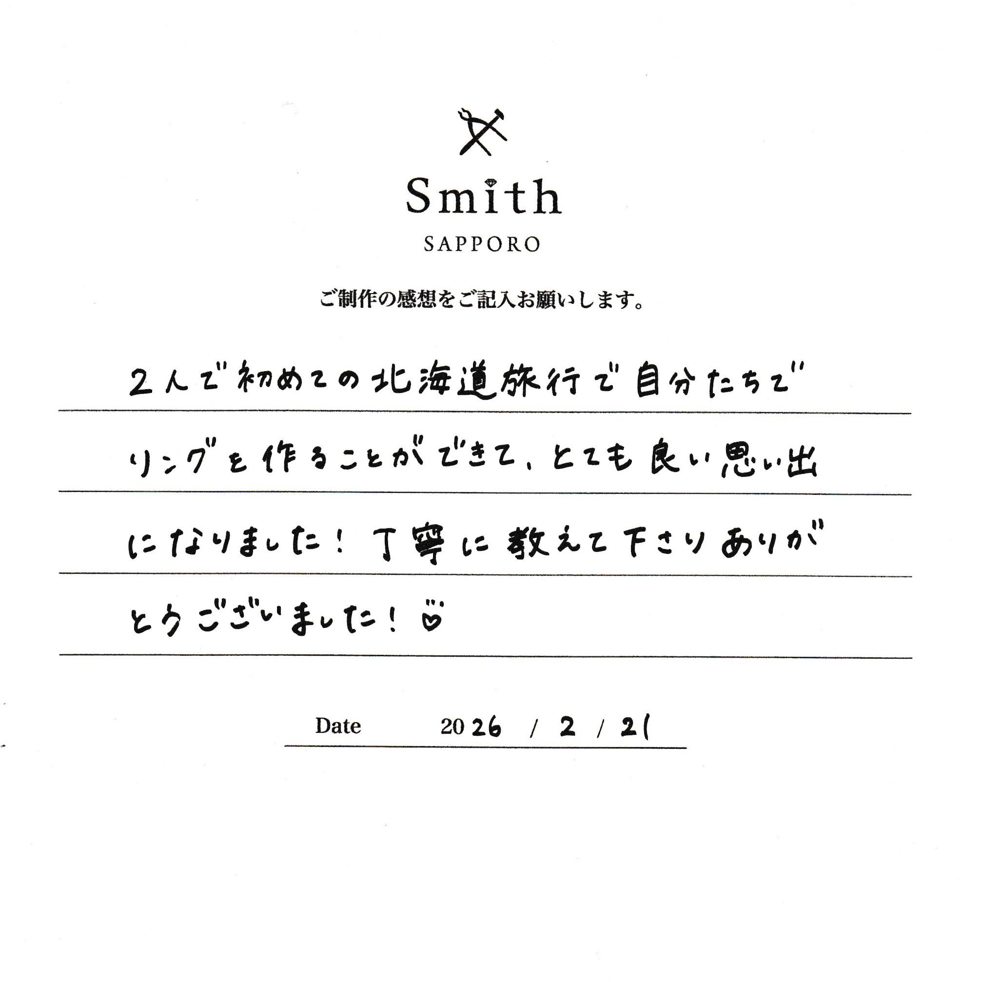 この度はペアリングの制作で工房Smith京王プラザホテル札幌店にご来店いただき、誠にありがとうございました。