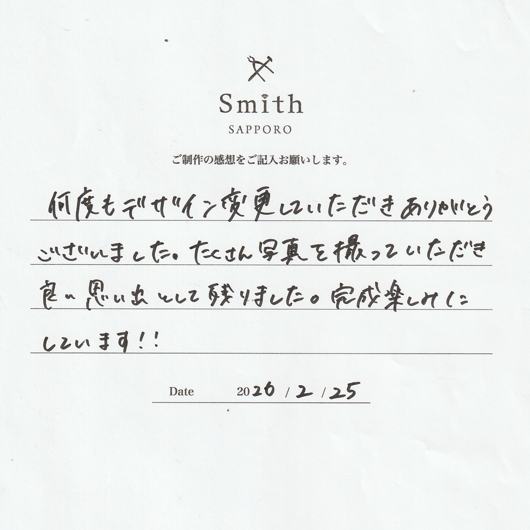 この度はペアリングの制作で工房Smith京王プラザホテル札幌店にご来店いただき、誠にありがとうございました。