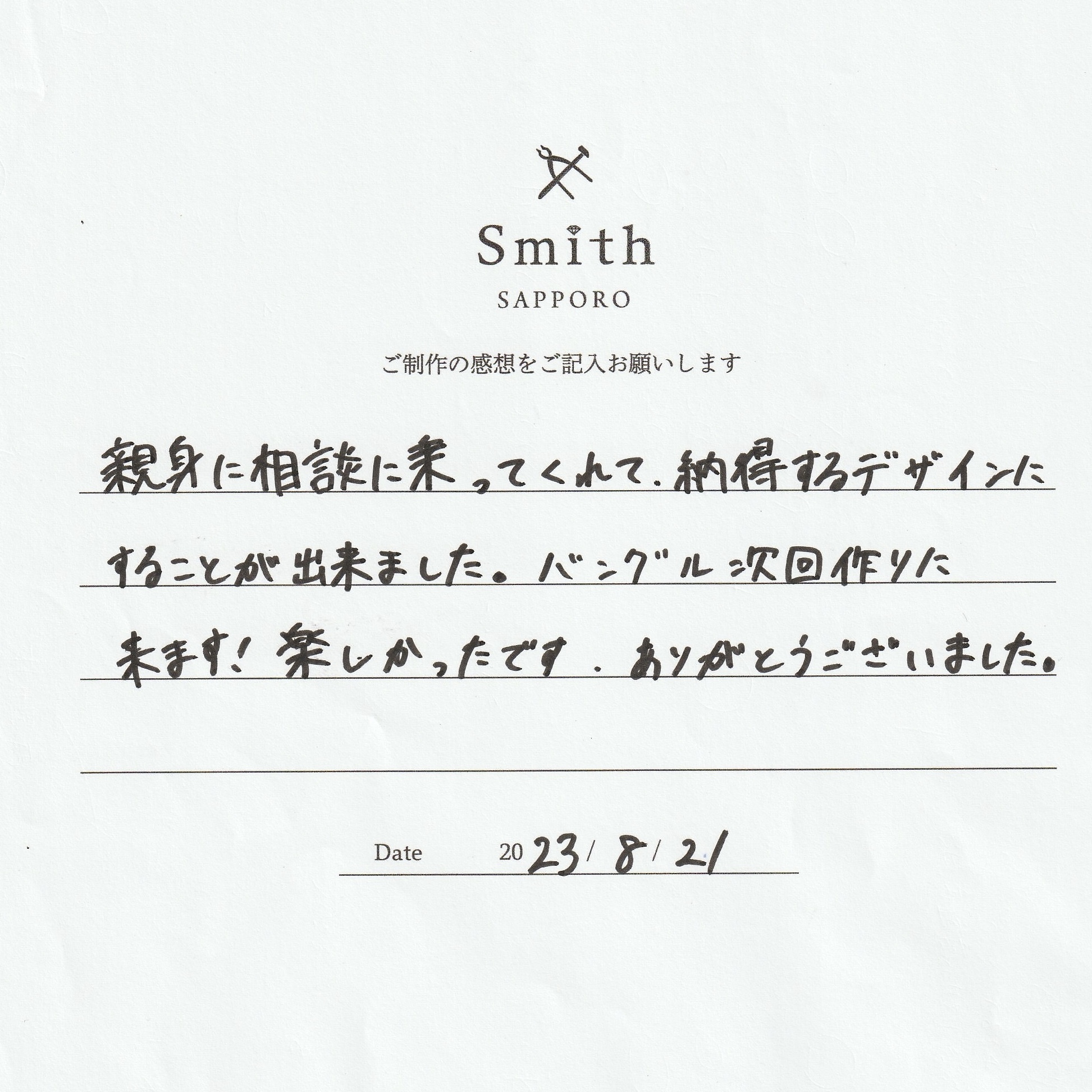 この度は工房スミス京王プラザホテル札幌店をご利用頂きまして誠にありがとうございました。
