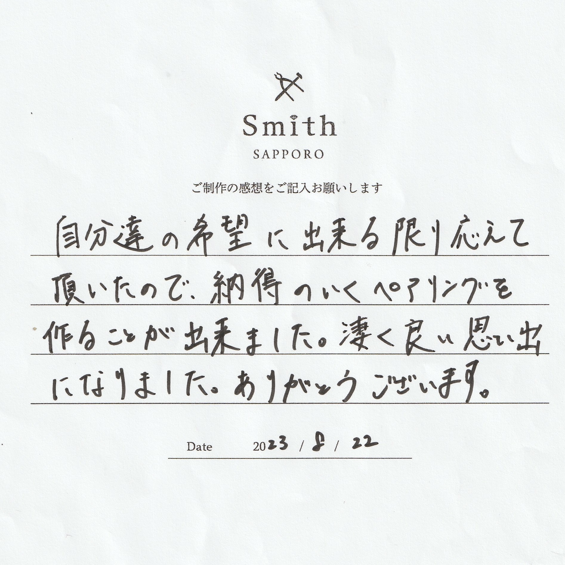 自分達の希望に出来る限り応えて頂いたので、納得のいくペアリングを作ることが出来ました。