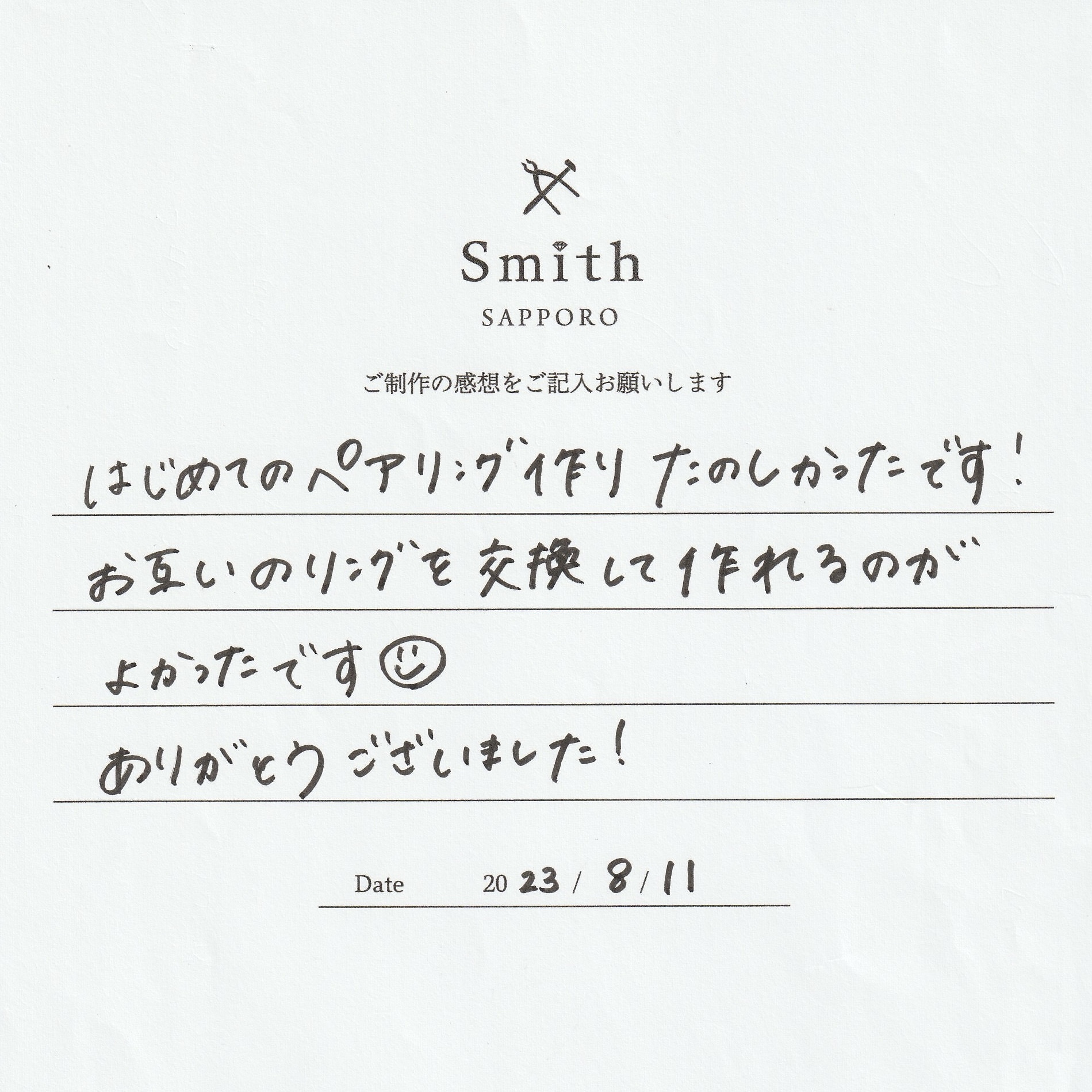 この度は、ペアリング作りに当店をお選び頂きまして誠にありがとうございました。