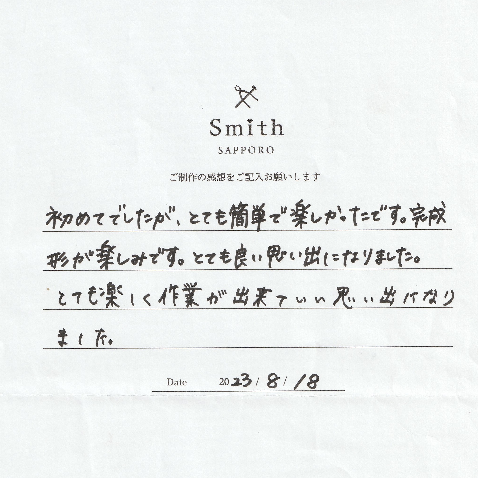 この度は工房スミス京王プラザホテル札幌店にお越しいただきまして誠にありがとうございました。